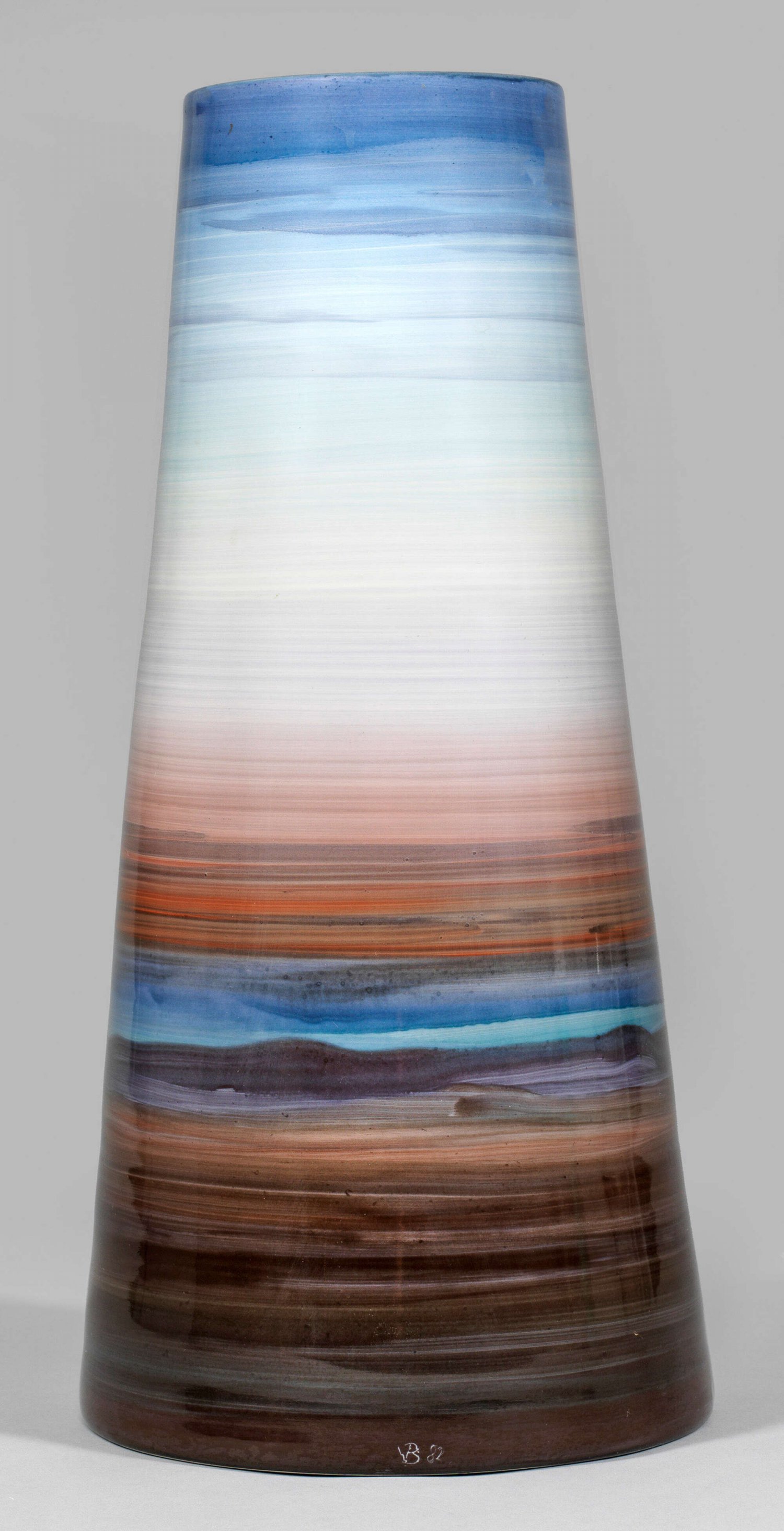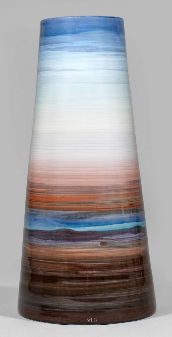 aus einer Atelierserie. Konischer Korpus mit flach abgesetztem Rand. Umlaufend mit breitem Pinselduktus geführter, streifiger Farbverlauf in fließenden Übergängen von erdbraunen über rötlichen bis himmelblauen Tönen in polychromer Emailmalerei. Form-Entw. Rudi Stolle, 1980. Nach Stolles Vorgaben frei gedreht von Gerhard Wronkowski. Dekor-Ausführung Volkmar Bretschneider, 1982. Künstler-Monogr. mit Dat. "RS und W 1980" sowie "VB (19)82". Schwertermarke. H. 44 cm.