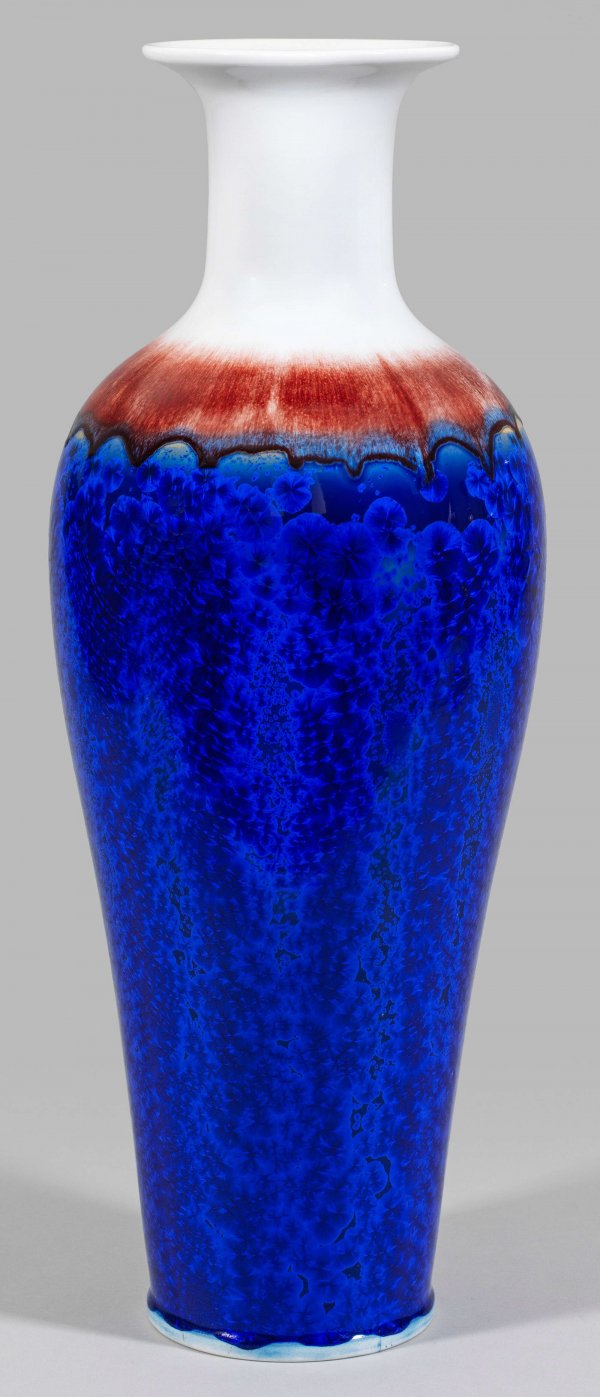 Große Unikat-Bodenvase mit "Kristallglasur" aus einer Atelierserie. Amphorenförmiger Korpus mit eingezogenem Hals und breit ausschwingendem Mündungsrand. Auf der Wandung, von der gerundeten Schulter abwärts verlaufende, eisenrot gestrichelte Glasur auf weißem Fond, übergehend in königsblaue Kristallglasur mit Längsstreifen-Strukturen aus dicht angeordneten, perlmutterartig leuchtenden "Eisblumen". Form- und Dekor-Entw. Ludwig Zepner. Künstler-Sign. „zp“. Unikat-Nr. 203/1997. Atelierzeichen und Schwertermarke in Aufglasur. H. 68 cm. D. 24 cm.
