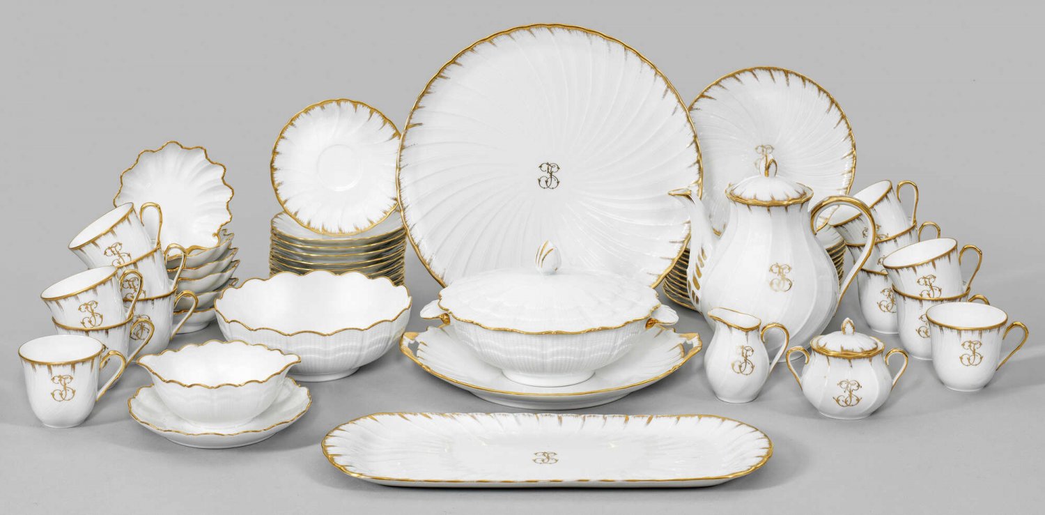 Kaffee- und Speiserestservice mit Golddekor 39-tlg.; Kaffeekanne, Zuckerdose, Sahnegießer, 12 Tassen mit Untertassen, 12 Kuchenteller, 3 Kuchenplatten, Beilagen- und 6 Dessertschalen, Sauciere, Deckelterrine. Geschweifter sowie Muschelrelief-Dekor mit reicher Goldstaffage. Teilw. Monogramm JS in Ligatur. Haarriss. Manufakturmarke. Kannen-H. 22 cm. Platten-D. 32 cm.