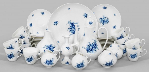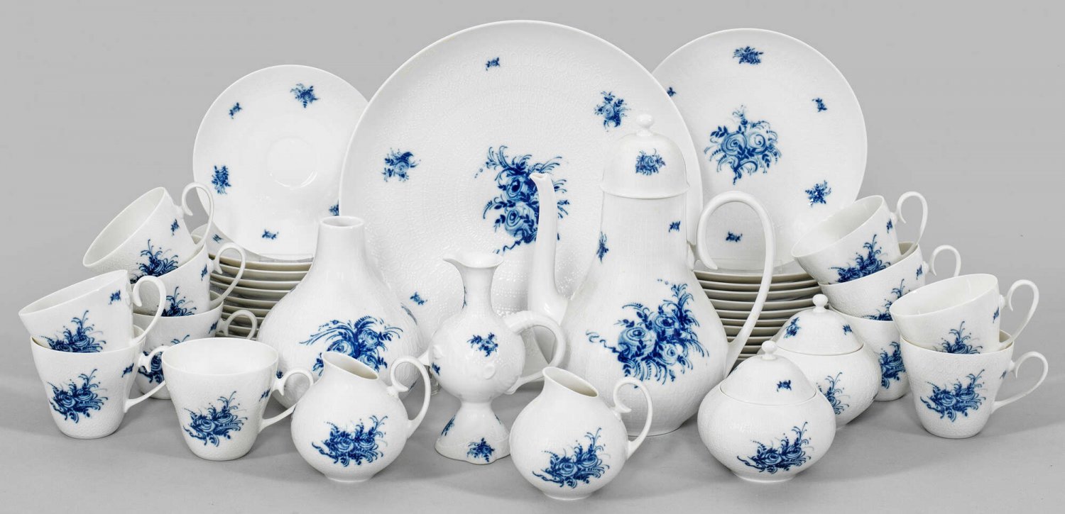 30-tlg.; Kaffeekanne, 2 Zuckerdosen, 2 Sahnegießer, 10 Tassen mit Untertassen, 12 Kuchenteller, Gebäckplatte, Ölkännchen und Vase. Form "Romanze". Sog. "Oliven-Relief"- sowie unterglasurblauer Blumendekor. Entw. Björn Wiinblad. Manufakturmarke. Kannen-H. 23,5 cm. Platten-D. 27 cm.