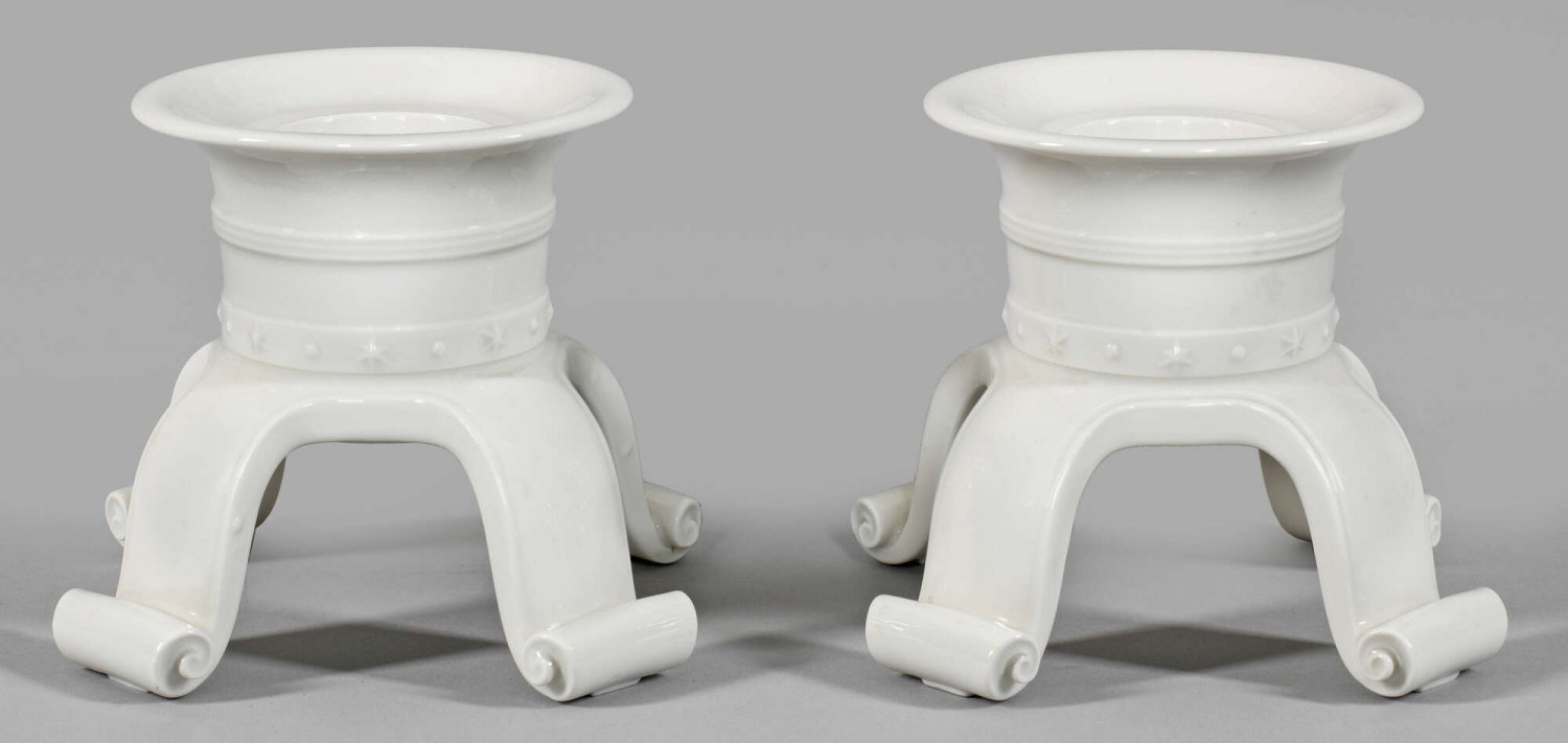 Paar Kerzenhalter Weißporzellan. Über vier geschwungenen Volutenfüßen kurzer, zylindrischer, von Reliefbändern gegliedeter Schaft mit weit ausschwingendem Rand. Entw. Carl Diebitsch, 1938/1939. Entw.-Bez.; Modell-Nr. 89. Manufakturmarke. H. 12 cm.