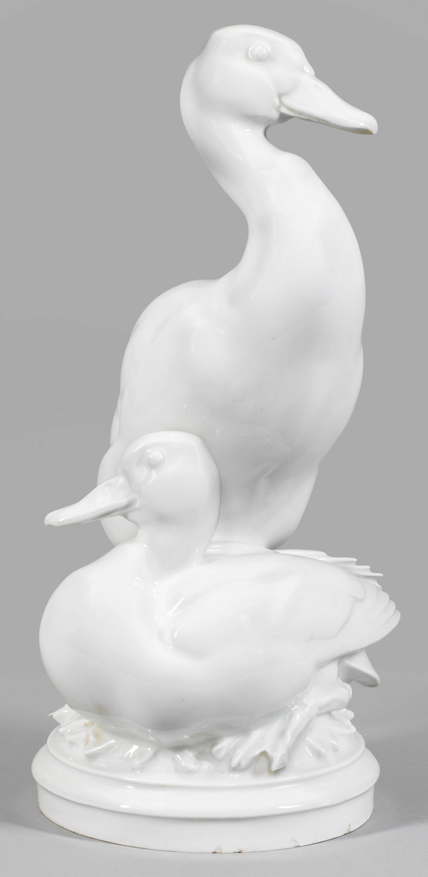 Große Figurengruppe "Zwei Wildenten". Originaltitel Weißporzellan. Auf rundem, profiliertem Sockel stehende bzw. hockende Wildenten. Entw. Max Esser, 1938. Modell-Nr. A 1298. Besch.; Schwertermarke. H. 52 cm.