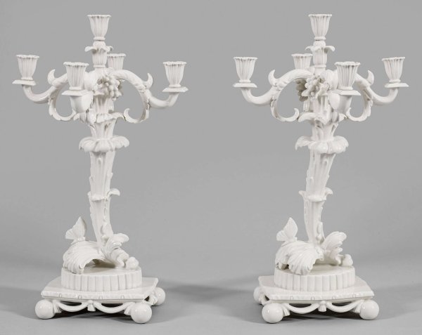 Paar prächtige Girandolen Elfenbeinfarbenes Porzellan. 5-flg.; Gegliedeter, von vier Kugelfüßen getragener Sockel mit Schleifenbehang. Über eingerollten Blättern mit sitzendem Schmetterling volutenartig aufsteigender Schaft aus stark reliefplastischen, von Weintrauben umzogenen Akanthusblättern. Davon ausgehend vier geschweifte, blattreliefierte Leuchterarme mit kelchartigen Tüllen über quadratischer Traufschale. Entw. Joseph Wackerle, 1924. Modell-Nr. 1086. Manufakturmarke. H. 59 cm.