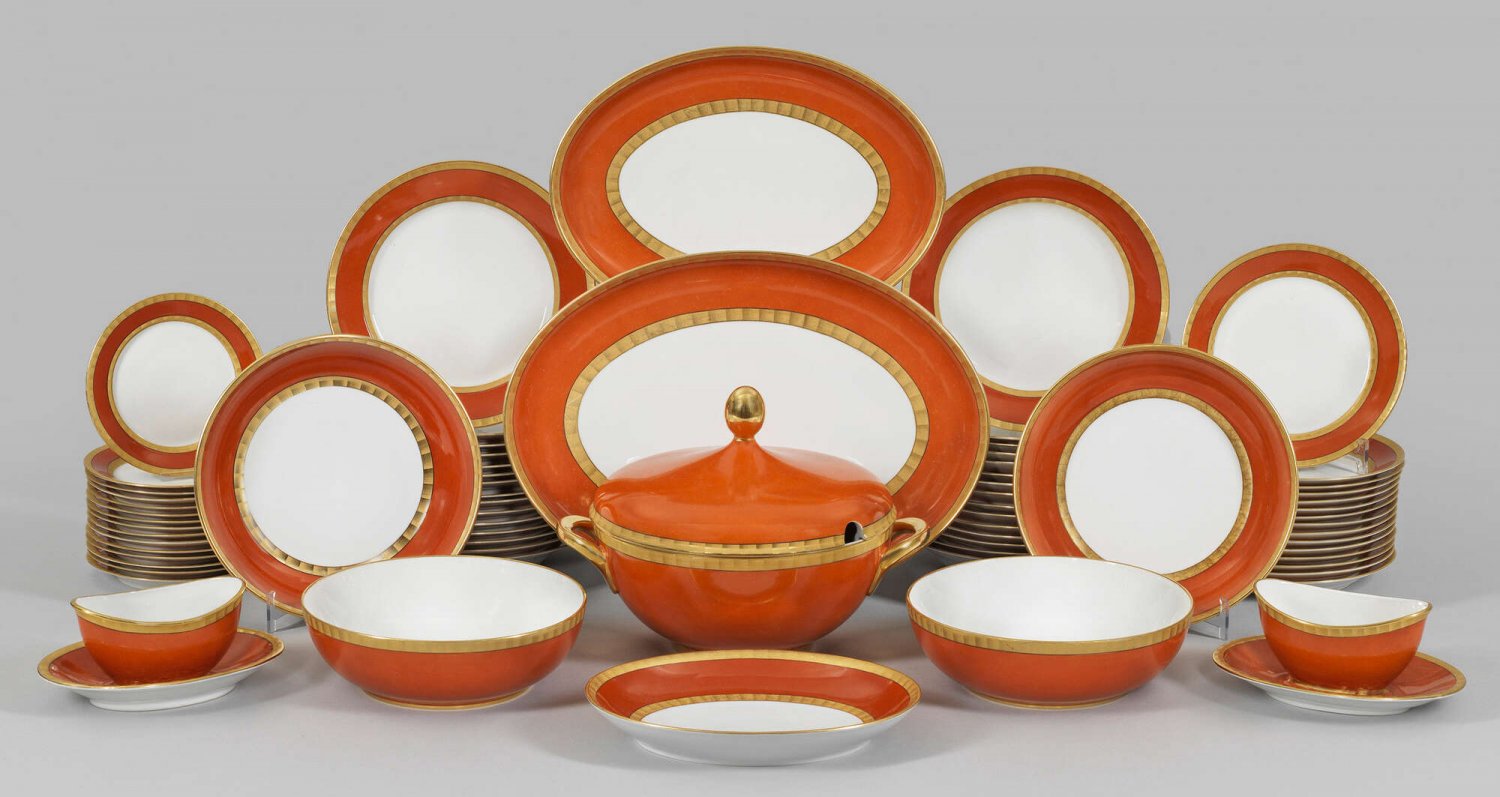 Speiseservice "Ibis" für 14 Personen von Wolfgang von Wersin 70-tlg.; 15 Vorspeise-, 15 Speise-, 15 Suppen-, 15 Brotteller, Terrine, 2 Saucieren, 7 Beilagenschalen. Form "Lotus". Dekor "Ibis". Schlichte, gewölbte, leicht ausladende Form mit nach oben geschwungenen Henkeln in Anlehnung an eine geöffnete Lotusblüte. Handgestuppter, korallenroter Fond (bzw. Terra-Fond) mit breiten, handgravierten Goldbändern und Vergoldung. Entw. Wolfgang von Wersin, um 1932 - 1936. Minim. Makel. Manufakturmarke. Neupreis ca. € 100.00,-.