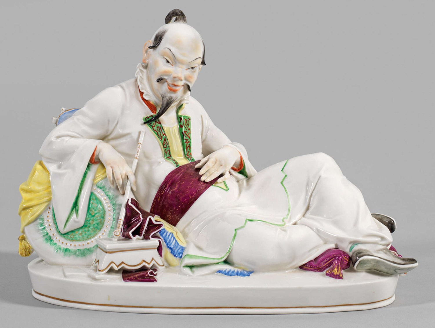 Art Déco-Figur "Chinese, liegend mit Pfeife". Originaltitel Auf querovaler Plinthe liegender, an hoch aufgebetteten Kissen lehnender Chinese, in der rechten Hand eine Opiumpfeife haltend. Polychrome Malerei mit dezentem Golddekor. Entw. Hugo Meisel, 1922. Entw.-Bez. mit Dat. "H. Meisel 22". Modell-Nr. U 418. Minim. rest.; Manufakturmarke. H. 28,5 cm. 39 cm x 20 cm.