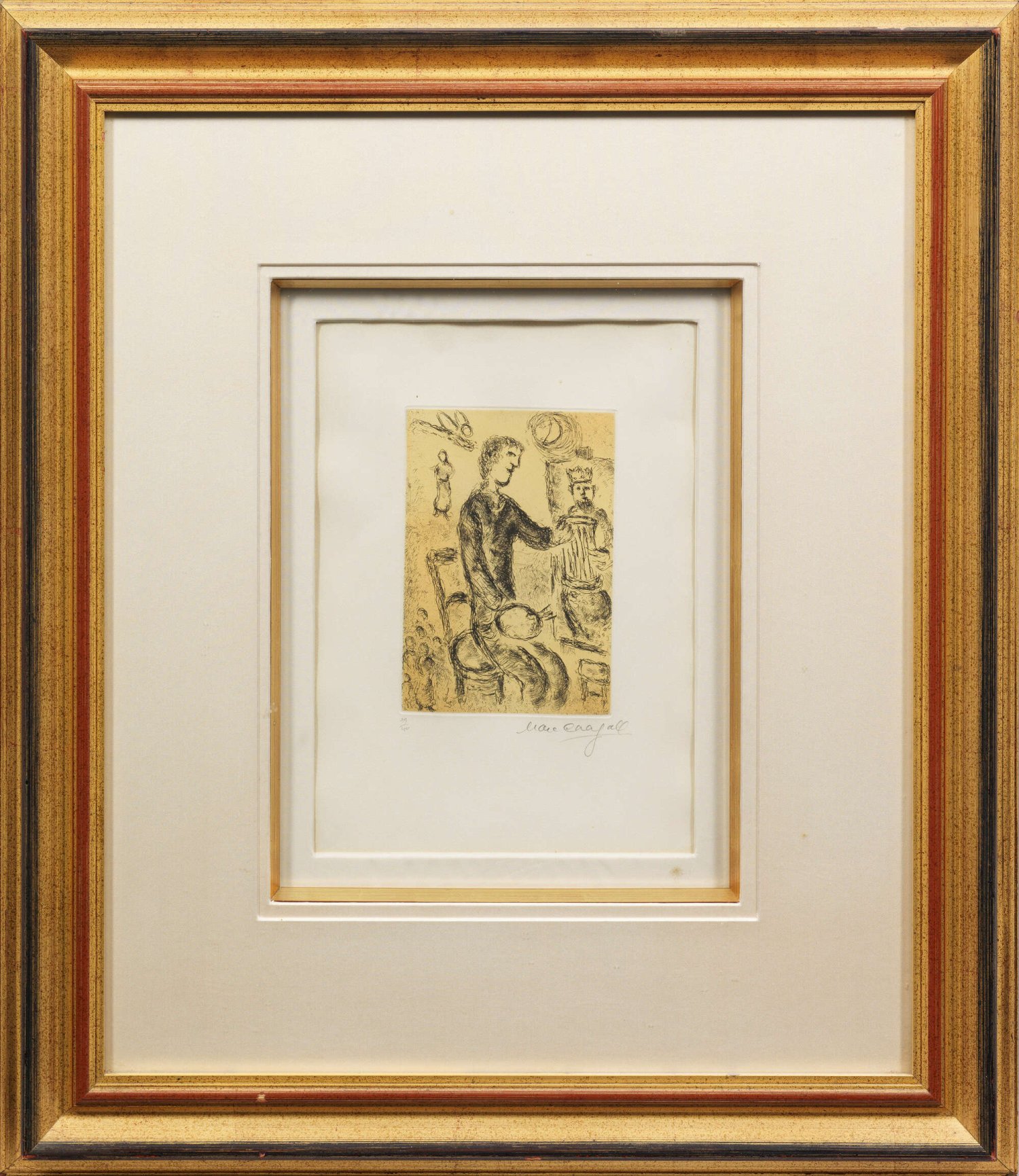 Radierung und Aquatinta/Arches, 1979/1980. Zweifarbiger Druck in Schwarz auf gelblichem Hintergrund. Aus der Serie "Psaumes de David" (Davids Psalmen). Ursprünglich geschaffen für das gleichnamige Buch mit 30 Radierungen, erschienen bei Gerald Cramer, Genf, 1979, in einer Auflage von 175 Expl. Das Buch war lediglich auf der Frontseite signiert und nummeriert. Zusätzlich erschien 1980 eine einzeln signierte Separatauflage von 40 Expl., aus der dieses Exemplar stammt. Sign. u. nummeriert 19/40. Plattenmaß 20,5 cm x 14,4 cm. Blatt ca. 35 cm x 26,5 cm. Rahmen.
