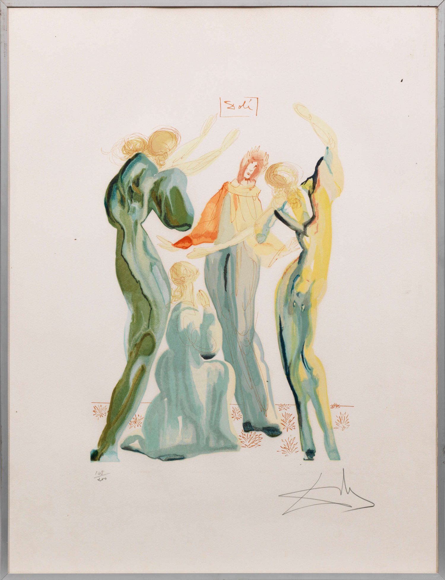 Farbholzstich u. Lithografie/Velin, 1960. Das berühmte sogenannte 101. Blatt aus der hundertteiligen Serie zu Dantes "Göttlicher Komödie". Wohl aus der Edition für Les Heures Claires 1963. Sign. u. nummeriert. Blattgröße 65 x 50 cm. Rahmen.