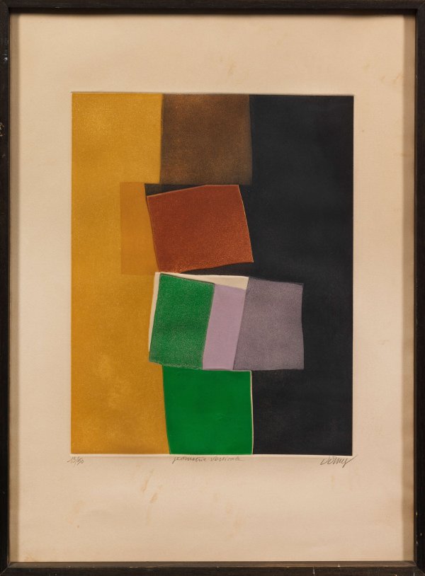 Farbaquantintaradierung/Velin, um 1955. Dorny lernte ab 1948 bei Johnny Friedländer und lehrte selbst in den 1970er Jahren an der École des Beaux-Arts in Paris. Werke u. a. im Centre Pompidou und Chicago Art Institute. Sign., nummeriert 13/50 u. betitelt. Plattenmaß ca. 49 cm x 39 cm. Rahmen.