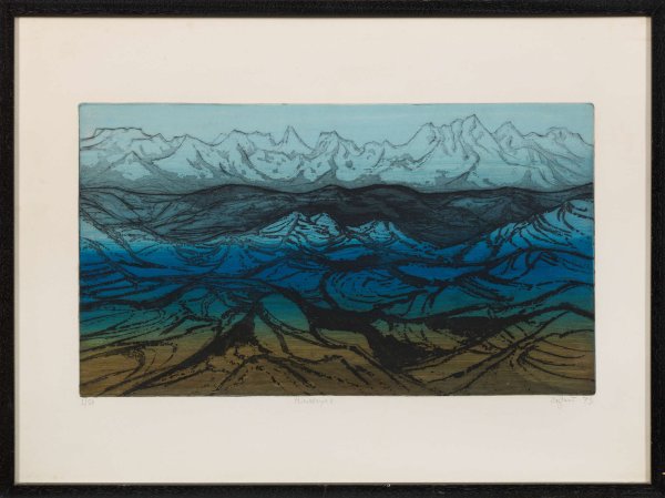 Aquatintaradierung/Velin, 1973. Das Werk entstand nach einem Studienaufenthalt des Künstlers in Nepal 1970. Von 1969 bis 1976 war Eglau Professor für Radierung an der Internationalen Sommerakademie in Salzburg. Sign., dat., nummeriert 2/50 u. betitelt. Plattenmaß ca. 37 cm x 65 cm. Rahmen.