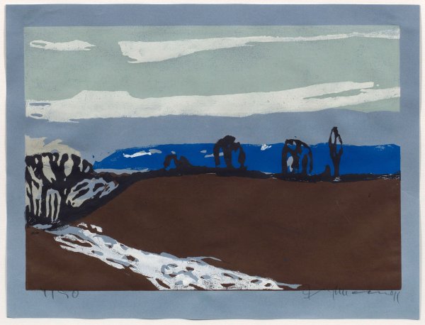 Linocut in colours on dove blue paper, 1991. Hand-signed, dated and numbered 9/50.