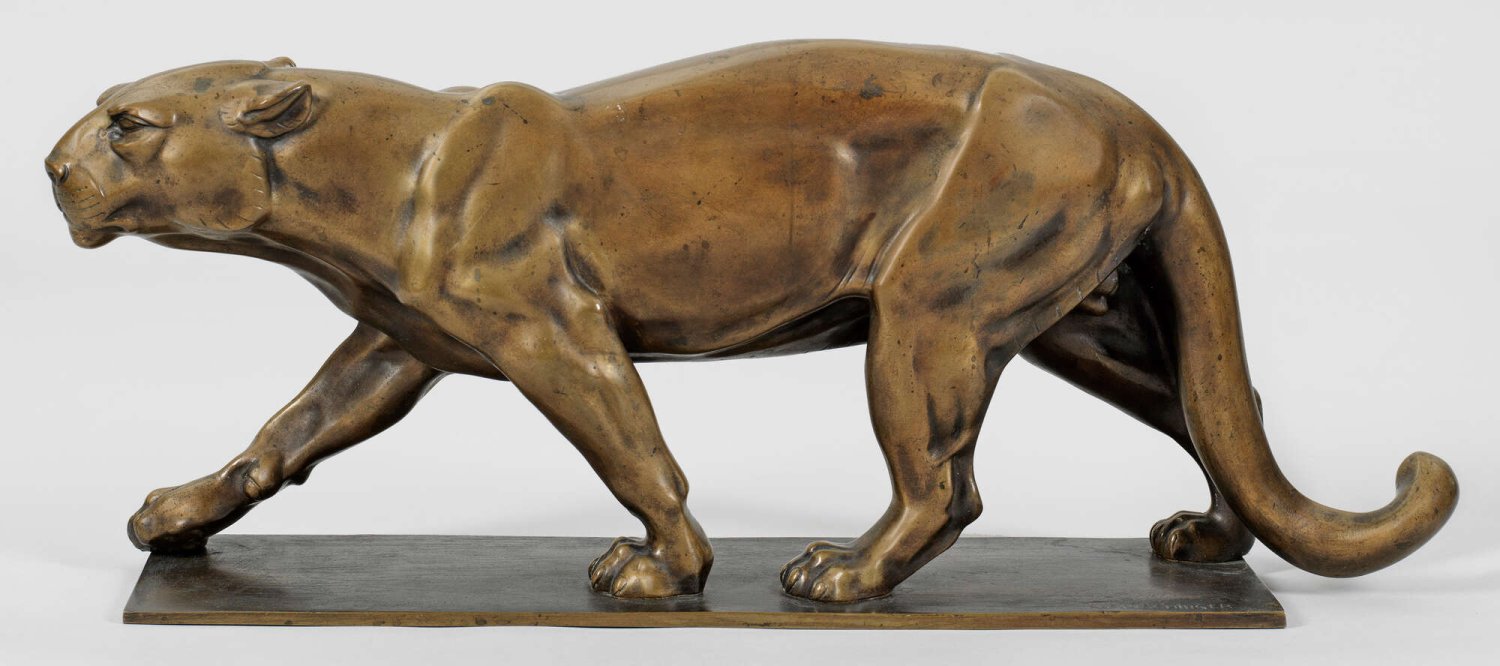 Bronze, braun patiniert. Sign.; Formal auf das Wesentliche reduzierte Bronze des modernen Bildhauers, der das Wesen des Panthers in Haltung und Umriss zum Ausdruck bringt. Pauschinger, der bei Rudolf Bosselt in Darmstadt studierte und Studienaufenthalte in Paris und Italien verbrachte, schuf vornehmlich Tierplastiken. 24,5 cm x 59 cm x 14 cm.