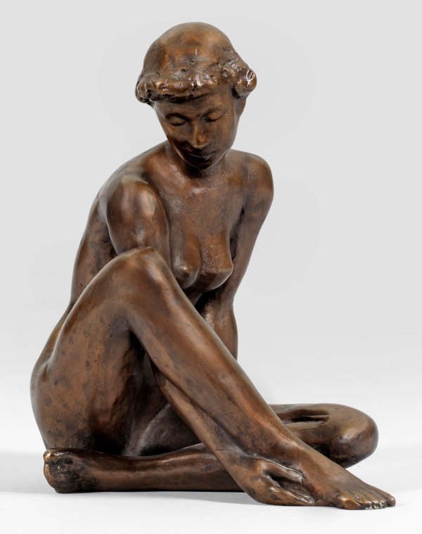 Bronze, braun patiniert, 1924/1955. Künstler-Monogramm "FK", Gießerstempel "STRASSACKER KUNSTGUSS SÜSSEN. Wvz. Braun 121. Vollplastische, moderne Darstellung eines hockenden, in sich selbst versunkenen Frauenakts, dessen besondere Schönheit und Ausgewogenheit in der geschlossenen, kontemplativen Komposition liegt. Die 1955 modellierte "Siesta" stellt eine verkleinerte Version der bereits 1924 geschaffenen Bronzeplastik "Beschaulichkeit" dar, wobei die Körperlichkeit kompakter und der Kopf weniger geneigt sowie das Haar summarischer mit veränderter Frisur ist. Es gehört in die Werkreihe mehrerer Neuinterpretationen, welche Klimsch in den 1950er Jahren schuf. H. 24,5 cm.