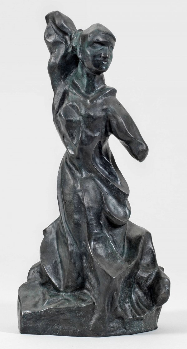 Bronze, dunkel patiniert. Monogr. "G". Posthumer, zeitgenössischer Guss (Ende 20./Anfang 21. Jh.) nach der 1911 geschaffenen Bronze. Gutfreund gehörte zu den bedeutendsten Bildhauern des tschechischen Kubismus. Nach einem ersten Bildhauerstudium 1906-1909 in Prag ging Gutfreund 1909 nach Paris, wo er 1909/10 bei Antoine Bourdelle an der Académie de la Grande Chaumière studierte und Auguste Rodin kennenlernte. 1911/12 entstanden in Prag erste eigenständige, kubo-expressionistische Skulpturen und Plastiken; 1913/14 wandte Gutfreund auch die Prinzipien des analytischen Kubismus an, 1913 beteiligte er sich an der legendären Ausstellung "Erster Deutscher Herbstsalon" in der Galerie "Der Sturm" in Berlin; 1914 reiste er nach Paris, wo er u. a. Picasso traf. H. 42,5 cm.