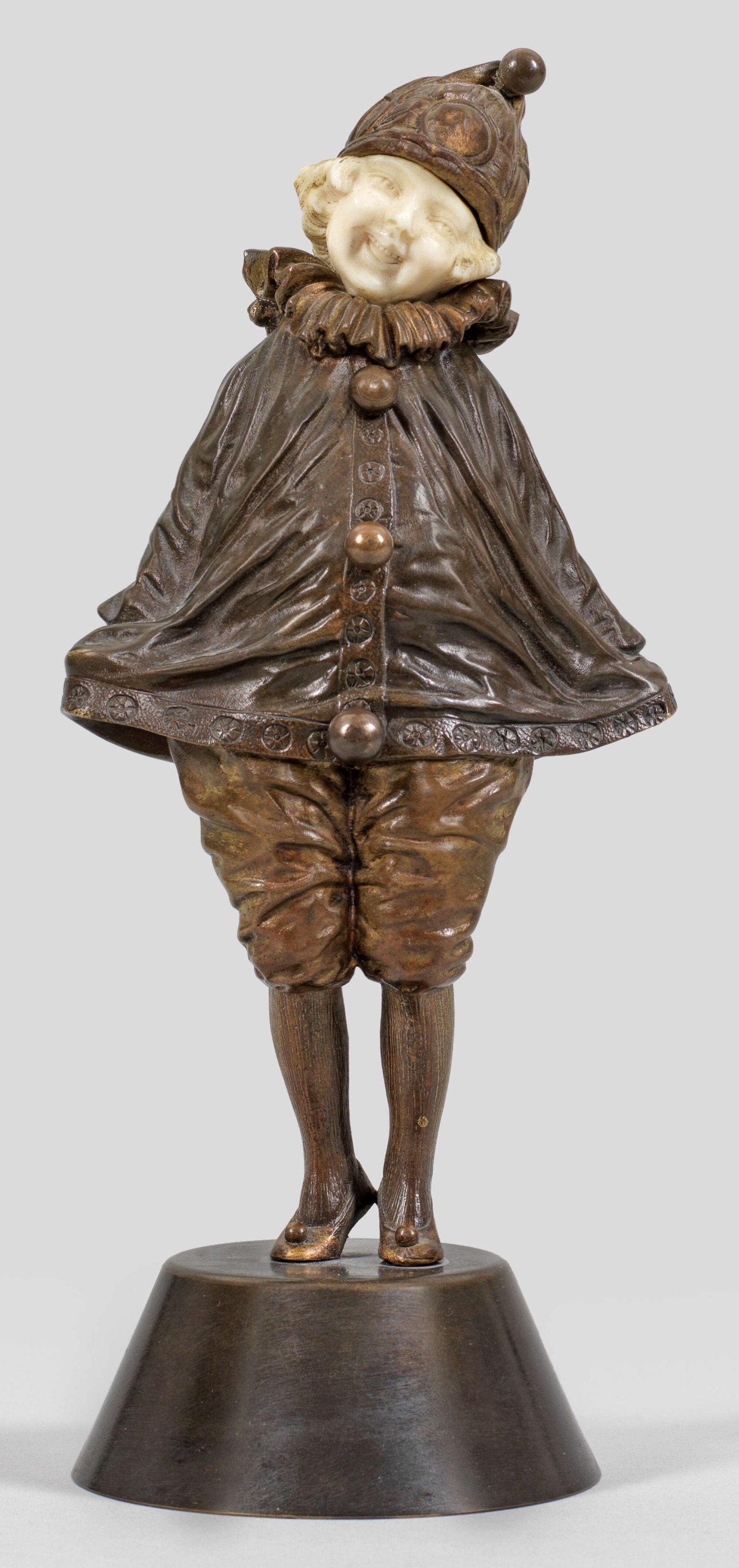 Bronze, in Brauntönen patiniert; Elfenbein, geschnitzt. Sign., Gießerinschrift "ETLING Paris". Auf einer konischen Plinthe stehendes, junges, lächelndes Mädchen in einem Pierrotkostüm, den Kopf geneigt und die Hände in den Taschen des ausgebreiteten Kostüms. Frühe Chryselephantin-Figur des bedeutenden, seit 1920 in Paris ansässigen Art Déco-Bildhauers der neben seinen bekannten Darstellungen von Tänzerinnen auch eine Reihe reizvoller, heiterer Kinderfiguren schuf. Ges.-H. 23 cm.