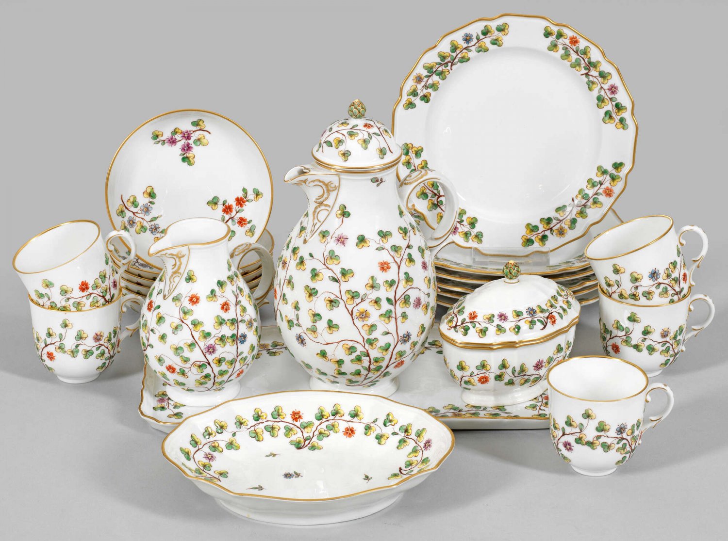 Kaffeeservice mit Dekor "Kleines Laubrelief" 15-tlg.; Kaffeekanne, Zuckerdose, Sahnegießer, 5 Tassen mit Untertassen, 6 Kuchenteller, Konfektschale. Sog. "Kleines Laubrelief"-Dekor aus aufsteigenden Blattranken mit dreiteiligen Blättern und Fliederblüten im Relief und polychromer Malerei. Goldrand. Entw. um 1765 - 1770. Manufakturmarke. Kannen-H. 22 cm. Kuchenteller-D. 18,5 cm.