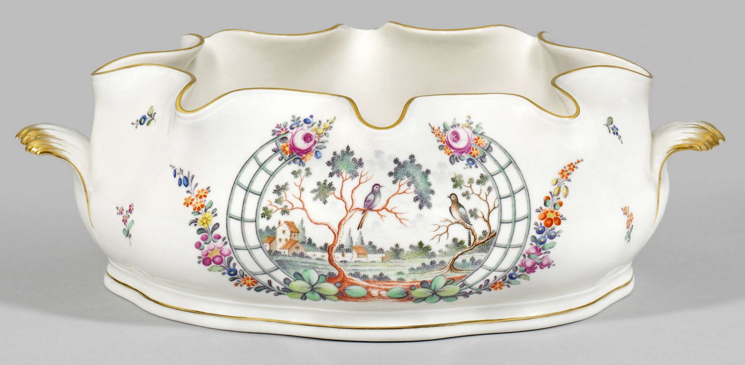 Gläserkühler mit Vogeldekor im Spalier Elfenbeinfarbenes Porzellan. Ovaler, buckelartig gewölbter Korpus mit blattartigen Henkeln. Nach innen eingezogener, tief gewellter Rand zum Einhängen von Gläsern. Farbenprächtiger "en treillage"- Dekor mit exotischen Vögeln in stilisierter Landschaft, umgeben von Streublumen in polychromer Malerei. Goldstaffage. Manufakturmarke. H. 10 cm. 31 cm x 21 cm.