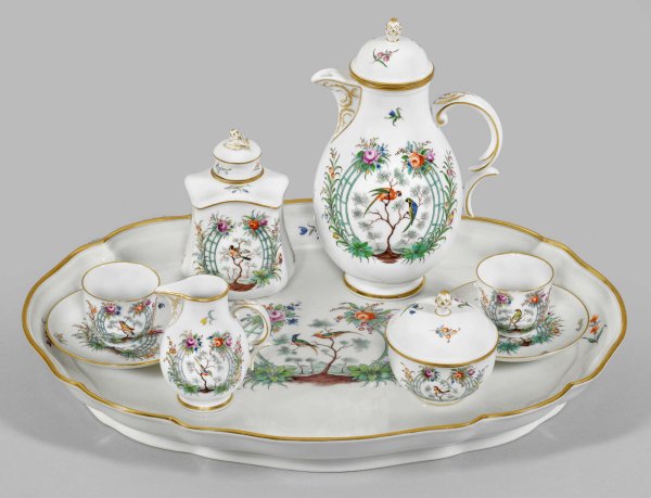 Mokka-Dejeuner mit Vogeldekor im Spalier 7-tlg.; Mokkakanne, Zuckerdose, Sahnegießer, 2 Tassen mit Untertassen, Teedose, Tablett. Auf der Wandung und im Spiegel farbenprächtiger Dekor aus exotischen, auf Ästen sitzenden Vögeln vor stilisierter Landschaft, gerahmt von dreiläufigen Spalierbögen ("en treillage") mit Blütenwerk und Streublumen in polychromer Malerei. Golddekor. Manufakturmarke. Kannen-H. 22 cm. Tablett 44 cm x 35 cm.
