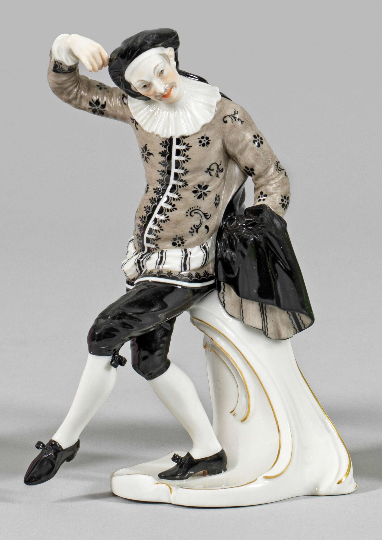 "Scaramuz" aus der Italienischen Komödie Auf Rocaillesockel, in Tanzschritt stehender Komödiant in blumig gemustertem grauen Wams und schwarzer Hose, seinen Umhang im linken Arm haltend. Polychrome Malerei mit Goldstaffage. Entw. Franz Anton Bustelli, 1759/1760. Manufakturmarke. H. 19,5 cm.