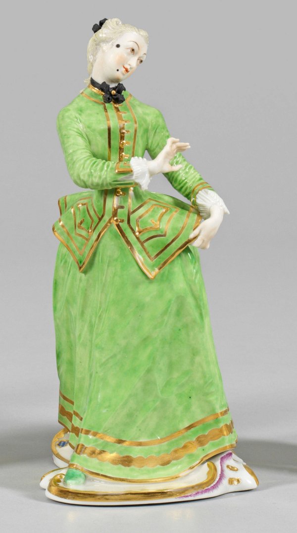"Julia" aus der Italienischen Komödie Auf geschweiftem Rocaillesockel, sich zur Seite wendende Julia in grüner Jacke über langem, gleichfarbigem Rock. Das gepuderte Haar zum Zopf zusammengefasst. Polychrome Malerei mit Goldstaffage. Entw. Franz Anton Bustelli, 1759/1760. Manufakturmarke. H. 21 cm.