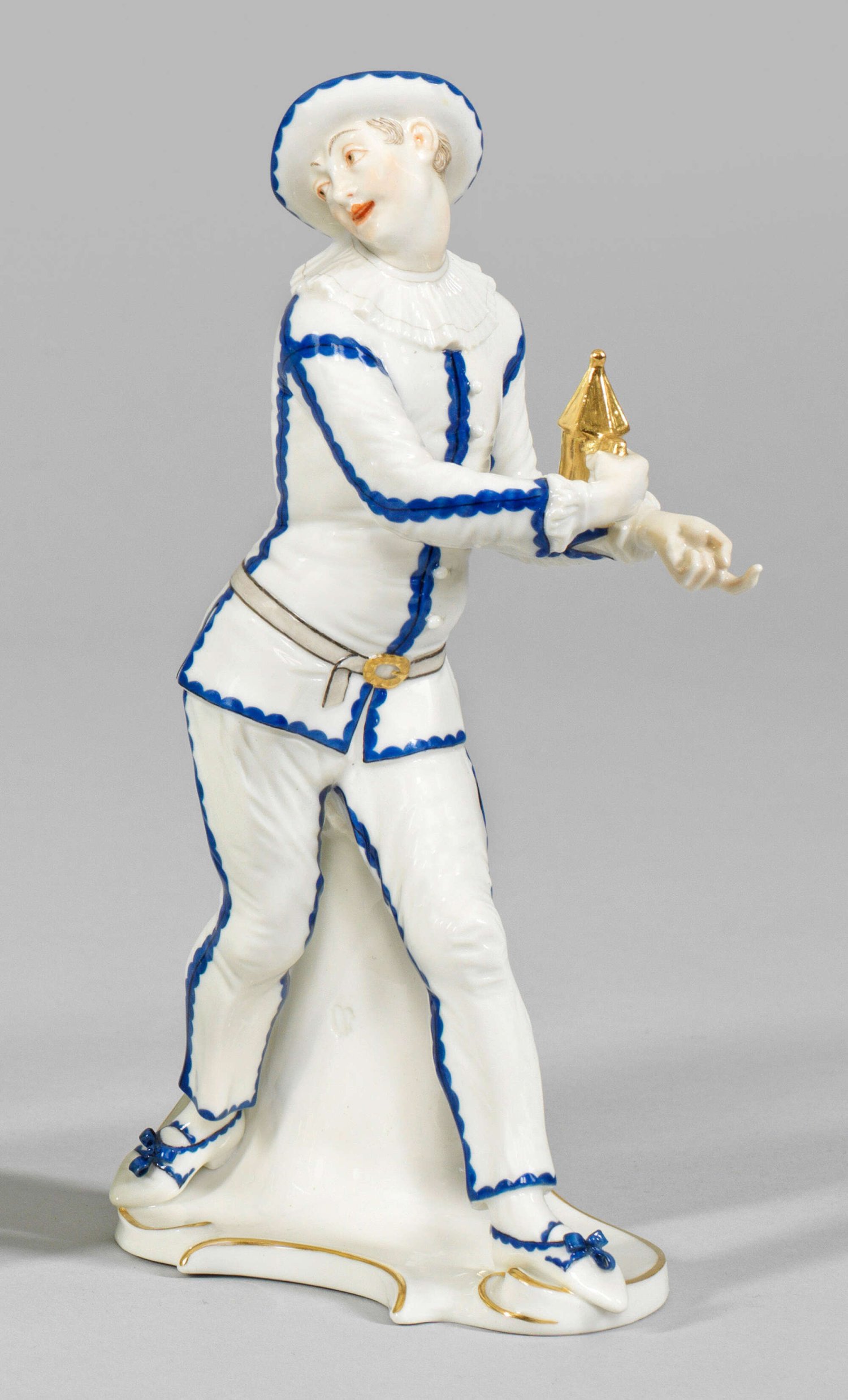 "Pierrot" aus der Italienischen Komödie Auf Rocaillesockel mit Stützvolute schreitender, sich zurückwendender Pierrot im Harlekinskostüm, in der Rechten eine Laterne haltend. Polychrome Malerei mit reicher Goldstaffage. Entw. Franz Anton Bustelli, 1759/1760. Manufakturmarke. H. 21 cm.