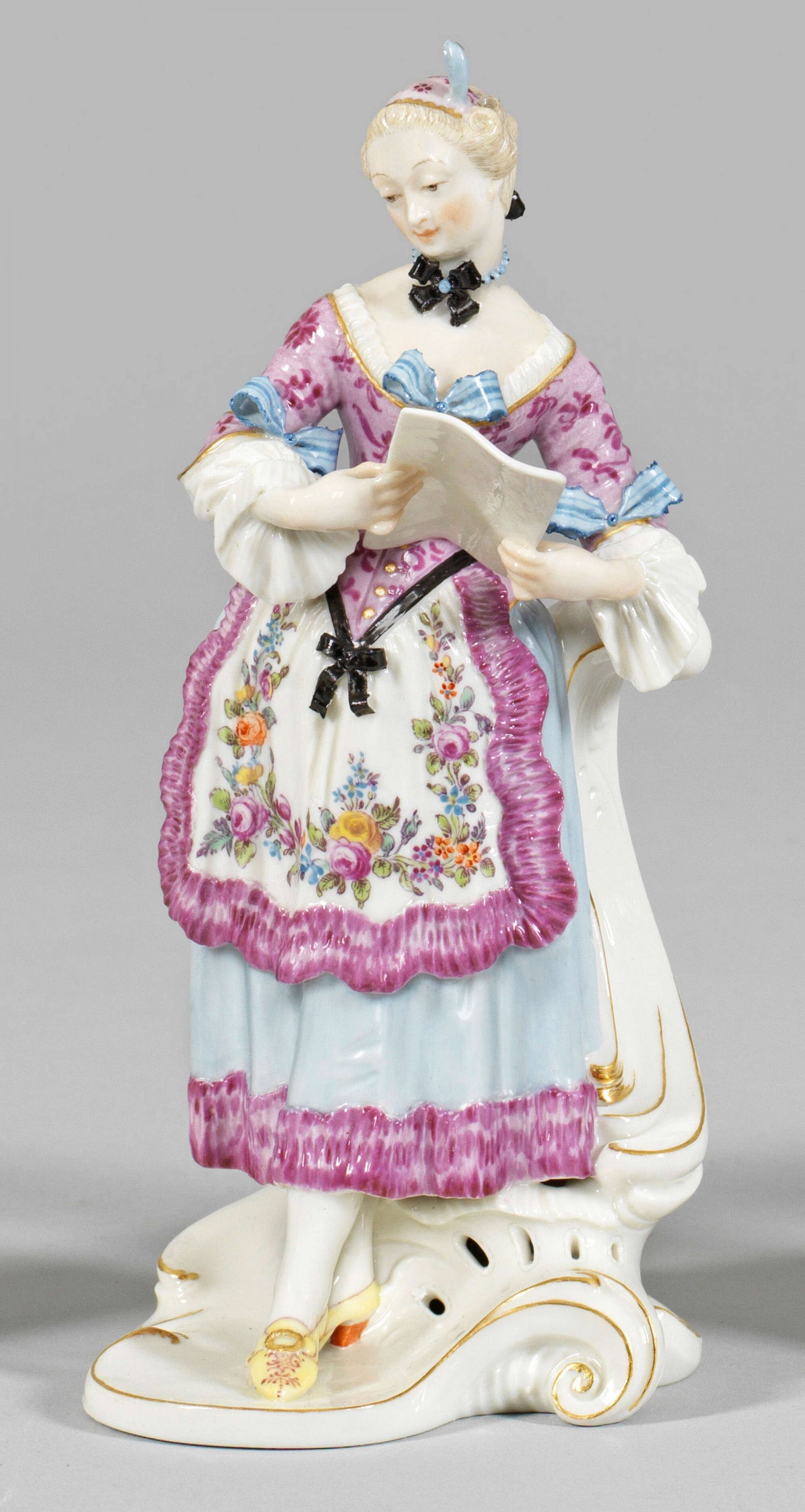 "Corine" aus der Italienischen Komödie Auf Rocaillesockel stehende Dame in hellblauem Rock, blumig gemustertem Mieder und Schürze, einen Brief in den Händen haltend. Polychrome Malerei mit Goldstaffage. Entw. Franz Anton Bustelli, 1759/1760. Manufakturmarke. H. 19,5 cm.
