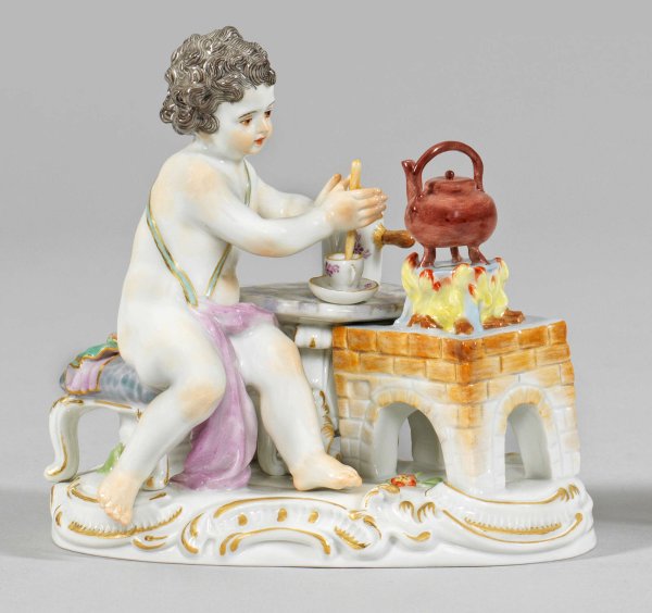 Amorette als Allegorie des Feuers aus der Serie "Vier Elemente". Auf rocaillereliefiertem Sockel, vor einem Herd mit Kanne über loderndem Feuer sitzende Amorette bei der Zubereitung von Trinkschokolade. Polychrome Malerei mit Goldstaffage. Entw. Johann Joachim Kaendler. Schwertermarke. H. 10,5 cm.