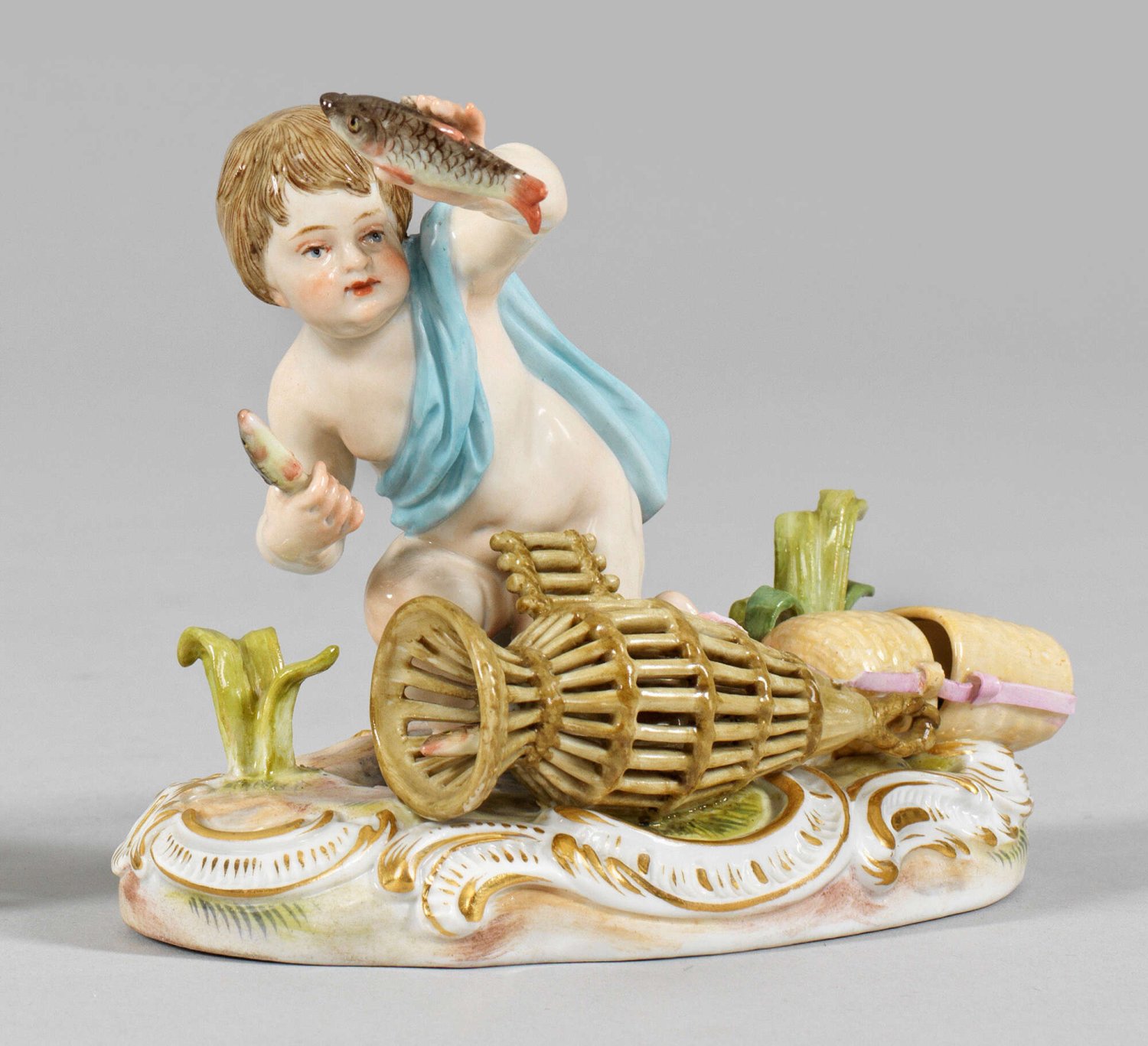 Amorette als Allegorie des Wassers aus der Serie "Vier Elemente". Auf rocaillereliefiertem Sockel kniender Knabe, in der rechten Hand einen Fisch haltend. Zu seinen Füßen liegender Fischfangkorb und Bastbehälter. Polychrome Malerei mit Goldstaffage. Entw. Johann Joachim Kaendler. Minim. besch.; Schwertermarke. H. 10,5 cm.