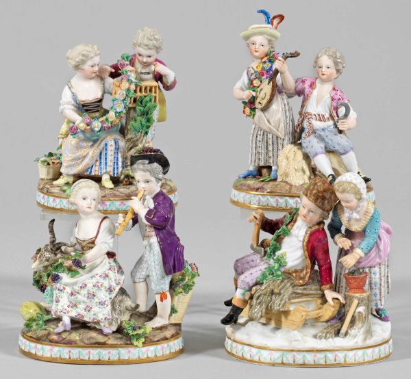 Vier Figurengruppen aus der Serie "Die vier Jahreszeiten" Ovaler Sockel mit reliefierter Palmettenbordüre. Auf naturalistisch gestaltetem Terrain komponiertes Kinderpaar. Mädchen und Knabe mit Blumengirlande und -korb, eine Voliere mit Vogelnest betrachtend bzw. ein, auf einem Ährenbündel sitzender Knabe in Begleitung eines Mädchens mit Hut und Laute als Allegorien des Frühlings und des Sommers. Sitzendes Kind auf einem, mit Weinranken behangenem Ziegenbock und Flötenspieler mit Weinkiepe bzw. Junge in pelzgefütterter Kleidung auf Schlitten mit Mädchen, sich die Hände an der Kohlenschale wärmend, den Herbst und Winter repräsentierend. Polychrome Malerei mit Goldkonturierung. Entw. Johann Joachim Schönheit. Modell-Nr. G 91 - G 94. Unw. rest.; Schwertermarke. H. 14,5 cm – 16,5 cm.