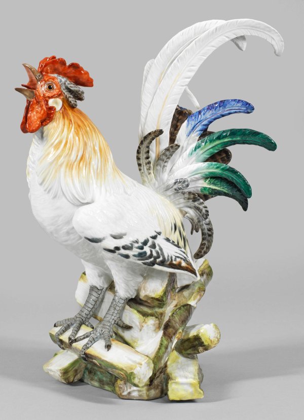 A large porcelain figure of a domestic rooster. Insignificantly restored. Crossed swords mark.
