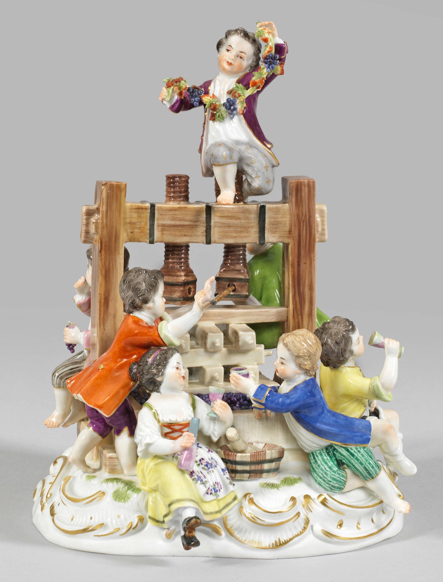 "Die Weinpresse". Originaltitel Auf rocaillereliefiertem Sockel große Weinpresse, umgeben von sieben Winzerkindern beim Pressen von Trauben. Schauseitig stehender Winzerjunge sowie drei weitere Winzerkinder, aus gefüllten Weingläsern trinkend. Oberhalb sitzender Knabe mit Weingirlande. Polychrome Malerei mit Goldkonturierung. Schwertermarke. H. 25 cm.