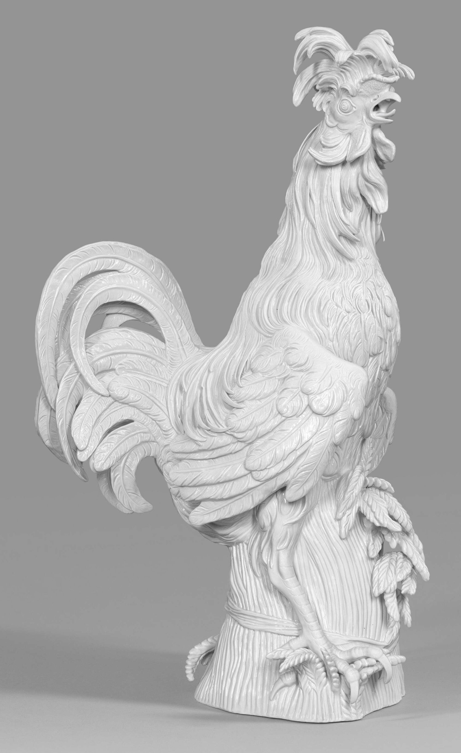 Große Tierplastik "Krähender Paduaner Hahn". Originaltitel Weißporzellan. Hoher, naturalistischer Sockel. Zwischen plastisch gearbeiteten Ährenbündeln aus Weizen stehender Haubenhahn mit langgestrecktem Hals, aufgerissenen Augen und weit geöffnetem Schnabel mit sichtbarer Zunge, dargestellt im Moment des Krähens. Äußerst naturgetreues, reliefplastisch gestaltetes Gefieder mit langen, gebogten Schwanzfedern. Entw. Johann Joachim Kaendler, 1732. Minim. Rep.; Schwertermarke. H. 75 cm. 45 cm x 33 cm.