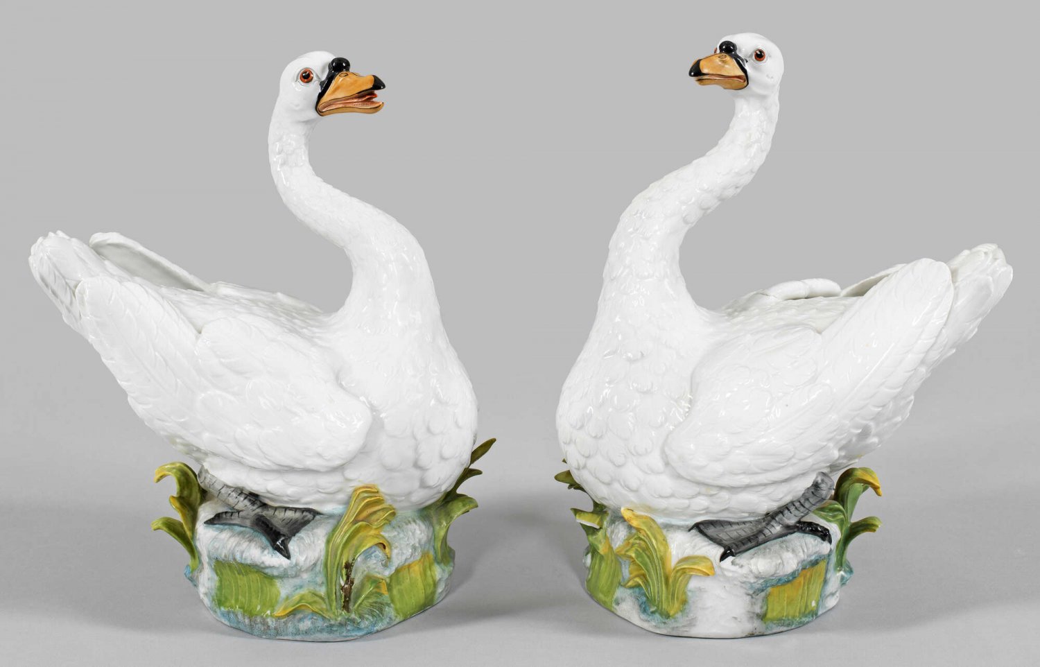 Paar Schwan-Figuren Auf stilisiertem Schilfsockel sitzender Schwan mit aufgerichtetem Kopf. Reliefiertes Federkleid sowie naturalistische Staffierung. Polychrome Malerei. Entw. wohl Johann Joachim Kaendler. Teilw. best.; Minim. rep.; H. 26,5 cm – 27 cm.