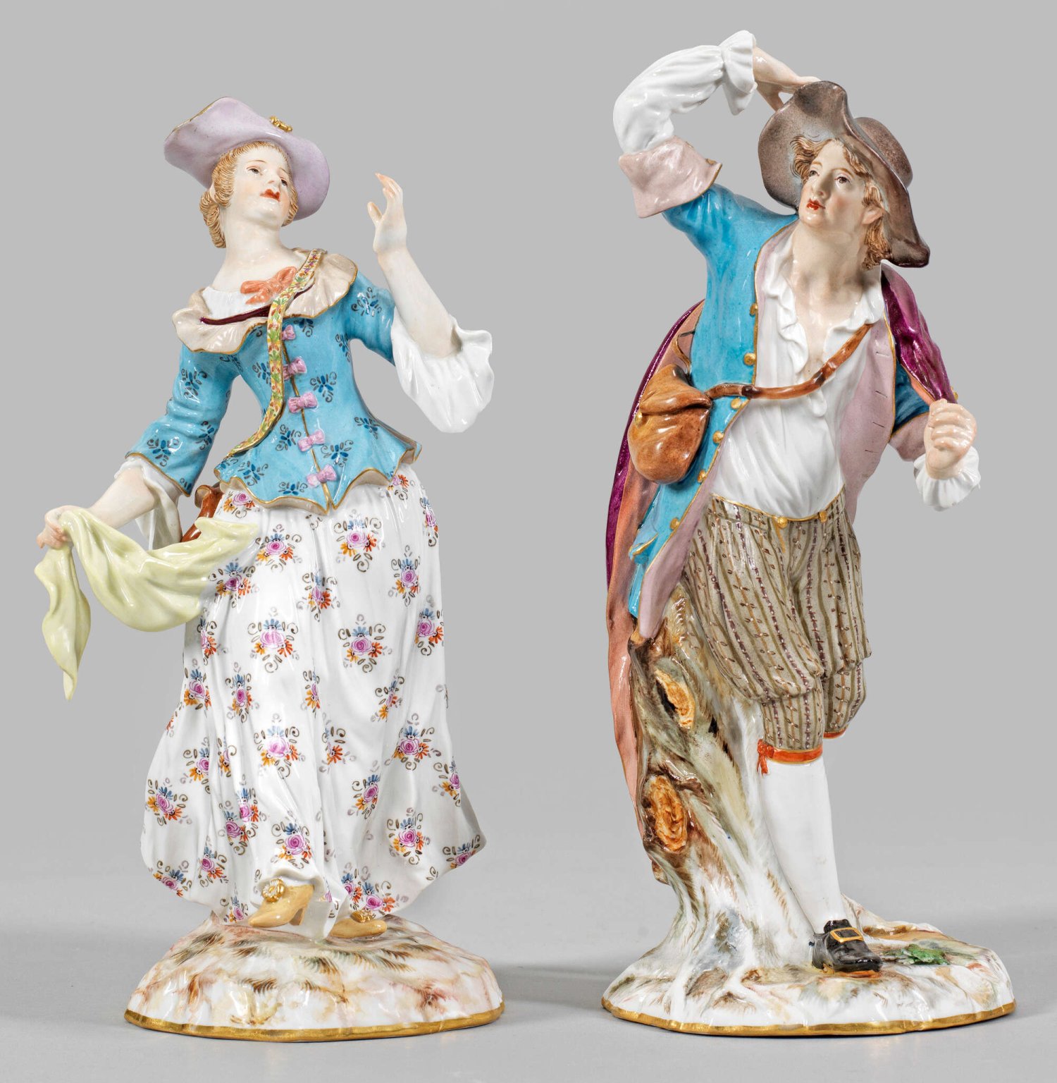 Paar Schäferfiguren Gegenstücke. Auf reliefiertem, naturalistisch gestaltetem Sockel stehende Schäferin bzw. Schäfer in Tanzhaltung mit Hut und Schultertasche in barocker, sommerlicher Kleidung. Polychrome Malerei mit Goldkonturierung. Entw. Johann Joachim Kaendler. Minim. rest.; Schwertermarke. H. 25 cm - 26,5 cm.