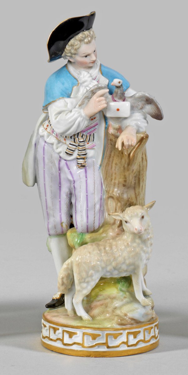 Schäfer mit Brieftaube Rundsockel mit reliefierter Ornamentbordüre. An einem Baumstumpf stehender Schäfer, einen Brief an die Brieftaube befestigend. Zu seinen Füßen ein Schaf. Polychrome Malerei mit Goldkonturierung. Entw. Michel Victor Acier. Minim. rest.; Schwertermarke. H. 19 cm.