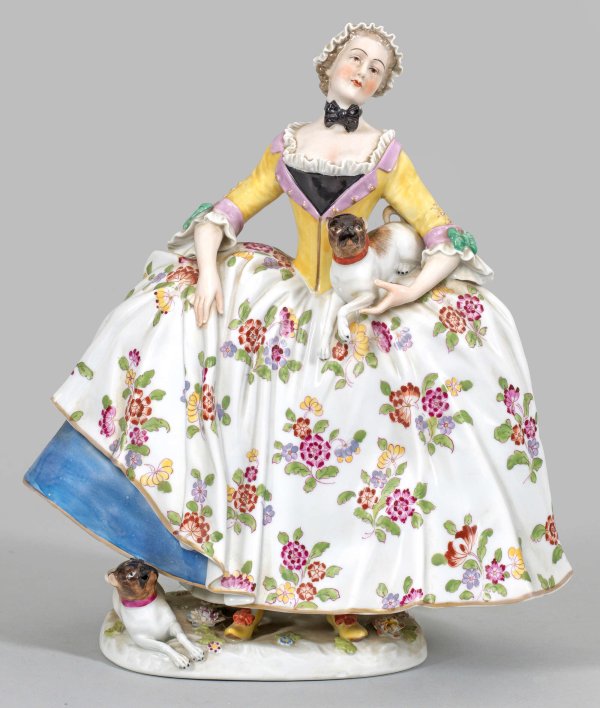 Krinolinendame Auf blütenbelegtem Sockel stehende Dame in einem prächtigen, von Indianischen Blüten gemusterten Krinolinenkleid, in der linken Hand einen Mops tragend. Polychrome Malerei mit Goldrand. Minim. best.; Manufakturmarke. H. 35,5 cm.