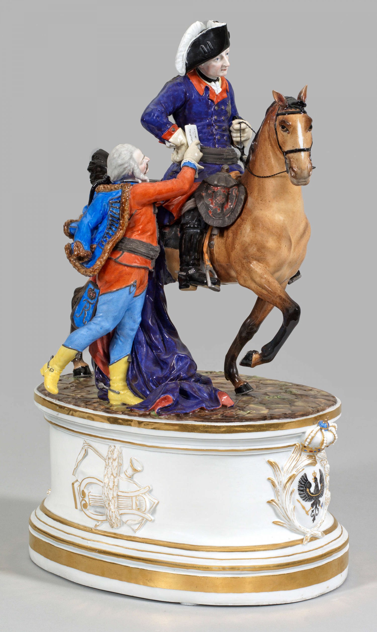 Hoher, ovaler, profilierter Podestsockel, schauseitig mit bekröntem, preußischem Adler in blattförmig gerahmter Reserve sowie umlaufend mit reliefplastisch aufgelegtem Stillleben aus lorbeerbekränzten Musikinstrumenten, Kriegstrophäen und einem Füllhorn mit Ährenbündel. Zu Pferd sitzender König Friedrich II. in blauer, ordensgeschmückter Uniform und schwarzen Stiefeln. Zur rechten Seite herbeitretender preußischer Reitergeneral Graf Hans Joachim von Zieten in blauer Husaren-Uniform, dem König eine Depesche übergebend. Polychrome Malerei mit Goldstaffage. Entw. Michel Victor Acier und Johann Carl Schönheit. Unw. rest.; Schwertermarke. H. 46 cm.