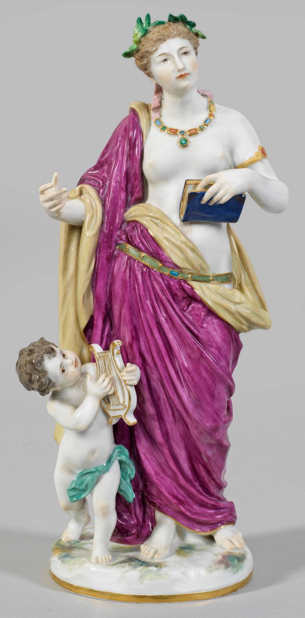 Allegorische Figur "Die Musik" Auf runder, naturalistisch staffierter Sockelplinthe stehende, lorbeerbekränzte Sängerin als Personifikation der Musik in antikisierendem Gewand, in der linken Hand ein Buch haltend. Seitlich stehender Putto, die Lyra spielend. Polychrome Malerei mit Goldstaffage. Entw. Johann Christian Hirt, um 1882 - 1885. Modell-Nr. N 161. Minim. rest.; Schwertermarke. H. 31 cm.