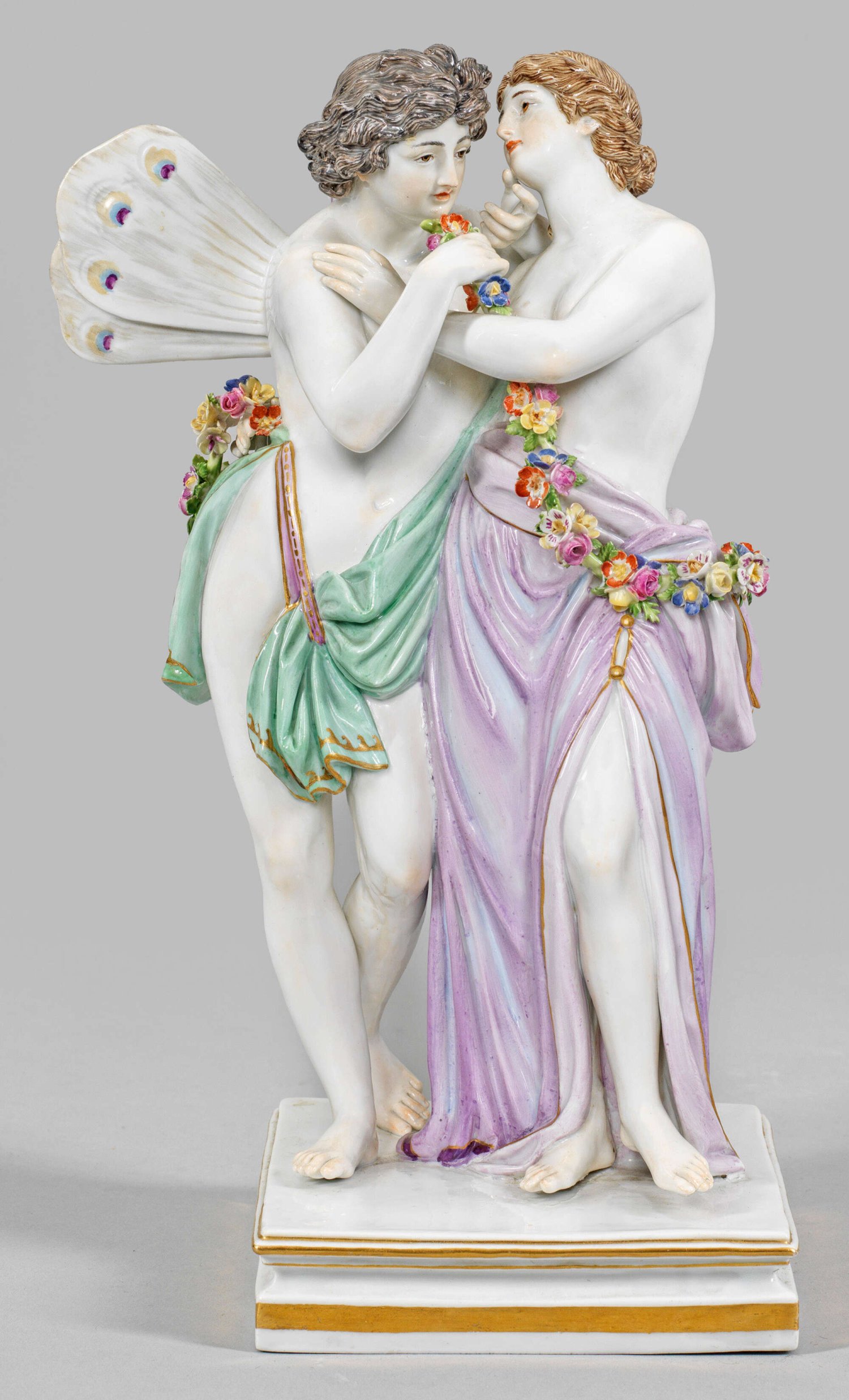 Mythologische Figurengruppe "Zephyr und Flora" Auf quadratischem, profiliertem Sockel innig beieinander stehendes, von einer Blumengirlande bekränztes Paar, der geflügelte Windgott Zephyr mit seegrünem Tuch und seine ihm zugeneigte Gattin Flora in purpurfarbenem Gewand. Polychrome Malerei mit Goldkonturierung. Entw. Christoph Gottfried Jüchtzer, 1786. Schwertermarke. H. 28 cm.