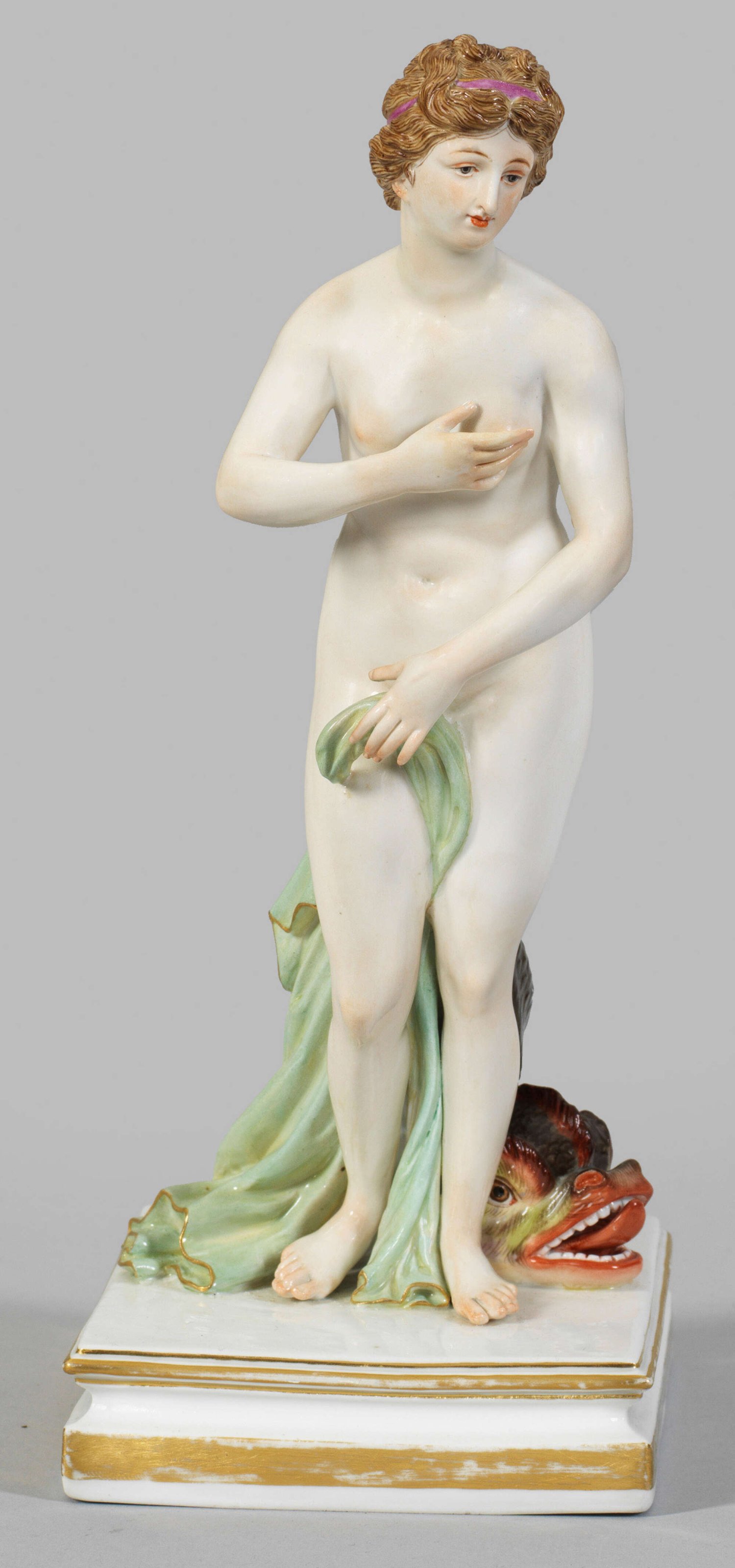 Venus mit Delphin Auf quadratischem, profiliertem Sockel stehende Venus mit Tuch vom Typus „Venus pudica“, ihre Brust und Scham mit der rechten bzw. linken Hand bedeckend. Seitlich als Stütze ein plastisch gearbeiteter Delphin. Polychrome Malerei mit Goldstaffage. Entw. Johann Carl Schönheit. Minim. rest.; Gold partiell ber.; Schwertermarke. H. 26 cm.