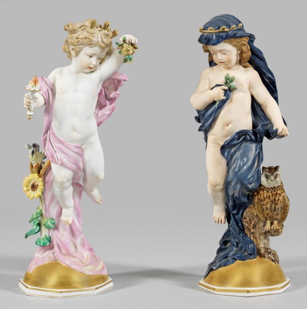 Über halbkugeligem Sockel stehende, weibliche Amorette mit dunkelblauem Umhang und Sternenkrone. Zu ihren Füßen eine, auf einem Baumstamm hockende Eule als Allegorie der Nacht. Als Gegenstück ein Putto mit Strahlenkrone und rosafarbenem Umhang unweit einer Sonnenblume, eine Fackel bzw. Blume haltend, den Tag symbolisierend. Polychrome Malerei mit Goldstaffage. Entw. Heinrich Schwabe, 1877 - 1880. Rest.; Schwertermarke. H. 35,5 cm - 36 cm.