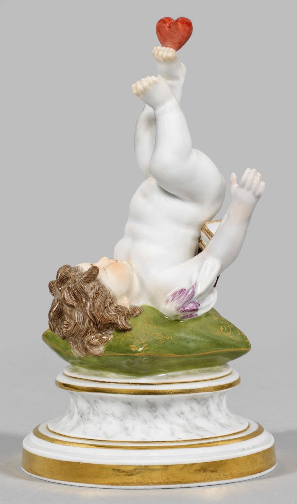 Profilierter Rundsockel. Mit den Flügeln auf einem olivgrün staffiertem, floral gemustertem Kissen liegende Amorette mit nach oben gestreckten Beinen, auf den Füßen ein rotes Herz balancierend. Polychrome Malerei mit Goldstaffage. Entw. Heinrich Schwabe, um 1877 - 1880. Modell-Nr. L 126 x. Unw. rest.; Schwertermarke. H. 15 cm.