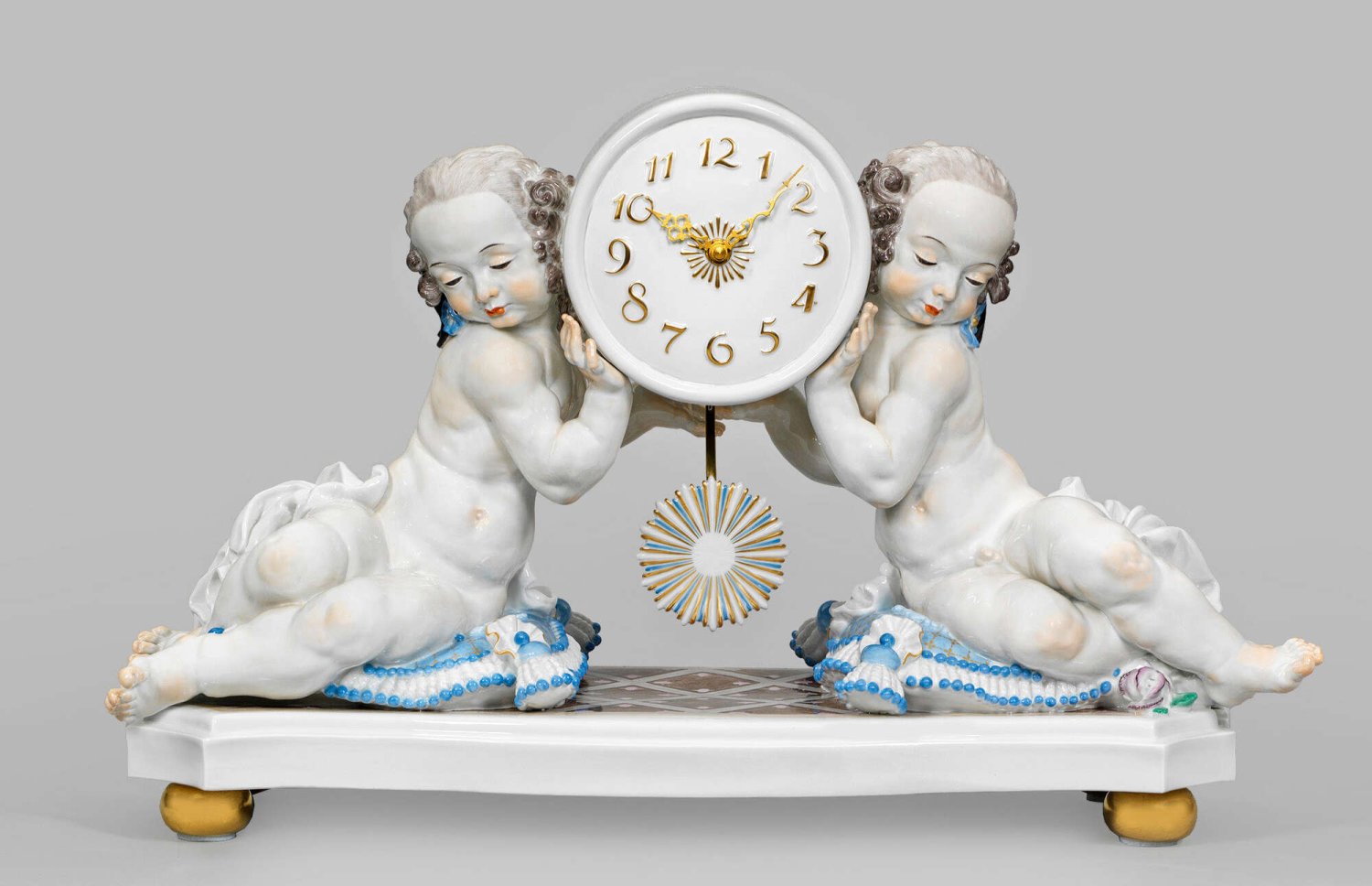 Große Kaminuhr "Uhr von zwei Putten getragen". Originaltitel Rechteckiger, geschweifter, an den Ecken abgeschrägter Sockel auf gedrückten Kugelfüßen. Darüber, jeweils auf Kissen zur Mitte gelehnt sitzendes Puttenpaar, Mädchen und Knabe, das zylindrische Uhrengehäuse stützend. Polychrome Malerei mit Gold. Auf weißem Zifferblatt vergoldete, arabische Ziffern in erhabenem Relief. In Hellblau und Gold staffiertes Porzellanpendel in Gestalt einer strahlenden Sonne. Entw. Paul Scheurich, 1915-19. Modell-Nr. 60830. Minim. Glasurmakel. Jahreszeichen. Schwertermarke. H. 37 cm. 60 cm x 23 cm.