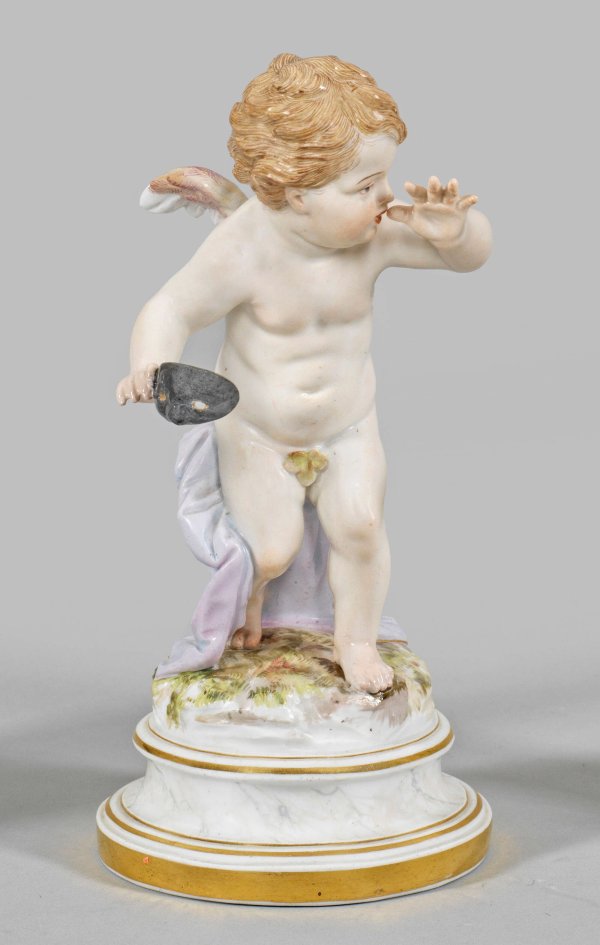 "Amor mit Maske, eine lange Nase drehend". Originaltitel Auf profiliertem Rundsockel stehender Amor mit einer Maske, sich mit der linken Hand zum Spott an die Nase fassend. Polychrome Malerei mit Goldstaffage. Entw. Heinrich Schwabe. Modell-Nr. L 110. Rest.; Schwertermarke. H. 19 cm.