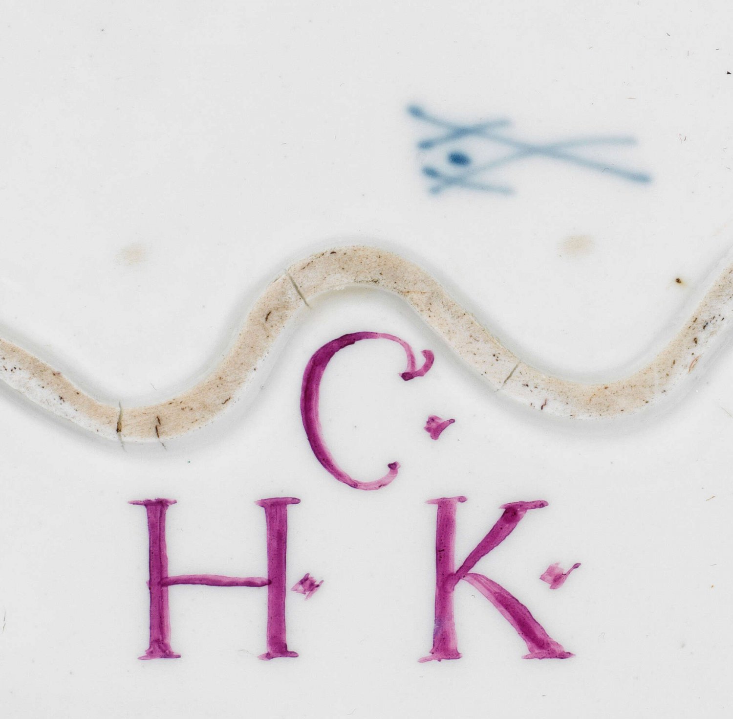 A porcelain bowl with "Red dragon" decor from the Royal court confectionery. Former's mark. Restored. Crossed swords with "C.H.K." confectioner‘s mark in purple.