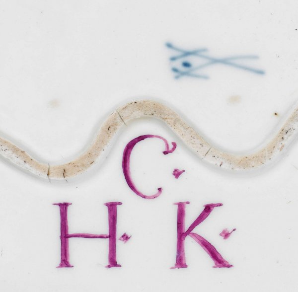 Passig geschweifte, gemuldete Form. Mittig zwei kreisförmig angeordnete Phönixe, gerahmt von zwei chinesischen Drachen sowie Arrangements aus buddhistischen Symbolen der sog. "Acht Kostbarkeiten". Eisenrote, Gold gehöhte Camaieumalerei. Im Boden bez. "C.H.K." in Purpur. Formerzeichen. Rest.; Schwertermarke. 28 cm x 22 cm.