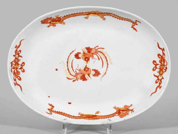 Ovale, gemuldete Form. Mittig zwei kreisförmig angeordnete Phönixe, gerahmt von zwei chinesischen Drachen sowie Arrangements aus buddhistischen Symbolen. Eisenrote, Gold gehöhte Camaieumalerei. Ber.; Schwertermarke. 34 cm x 24,5 cm.