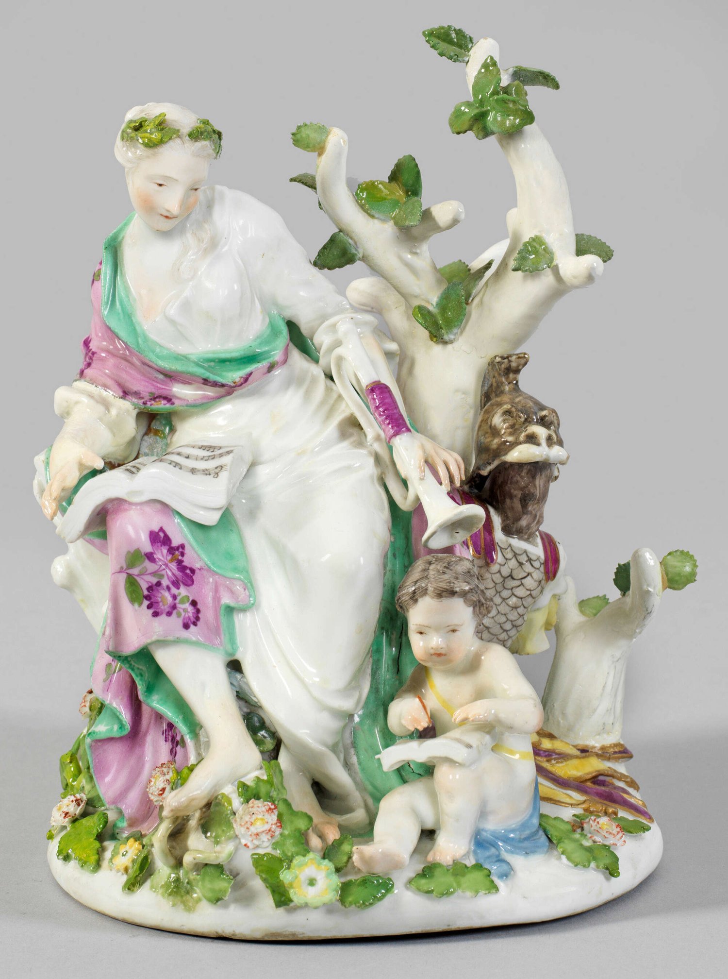Klio mit Amorette Auf rundem, mit plastischen Blüten und Blättern belegtem Sockel, unweit eines Laubbaumes sitzende, lorbeerbekränzte Klio in antikisierendem Gewand als Muse der Heldendichtung und Geschichtsschreibung. Zu ihren Füßen sitzende Amorette. Seitlich stehende, einen Baumstamm verhüllende Rüstung mit Helm in Gestalt eines Hundekopfes als Attribut des Krieges. Polychrome Malerei mit Gold. Entw. Johann Joachim Kaendler. Rücks. bez. "Clio". H. 20 cm.