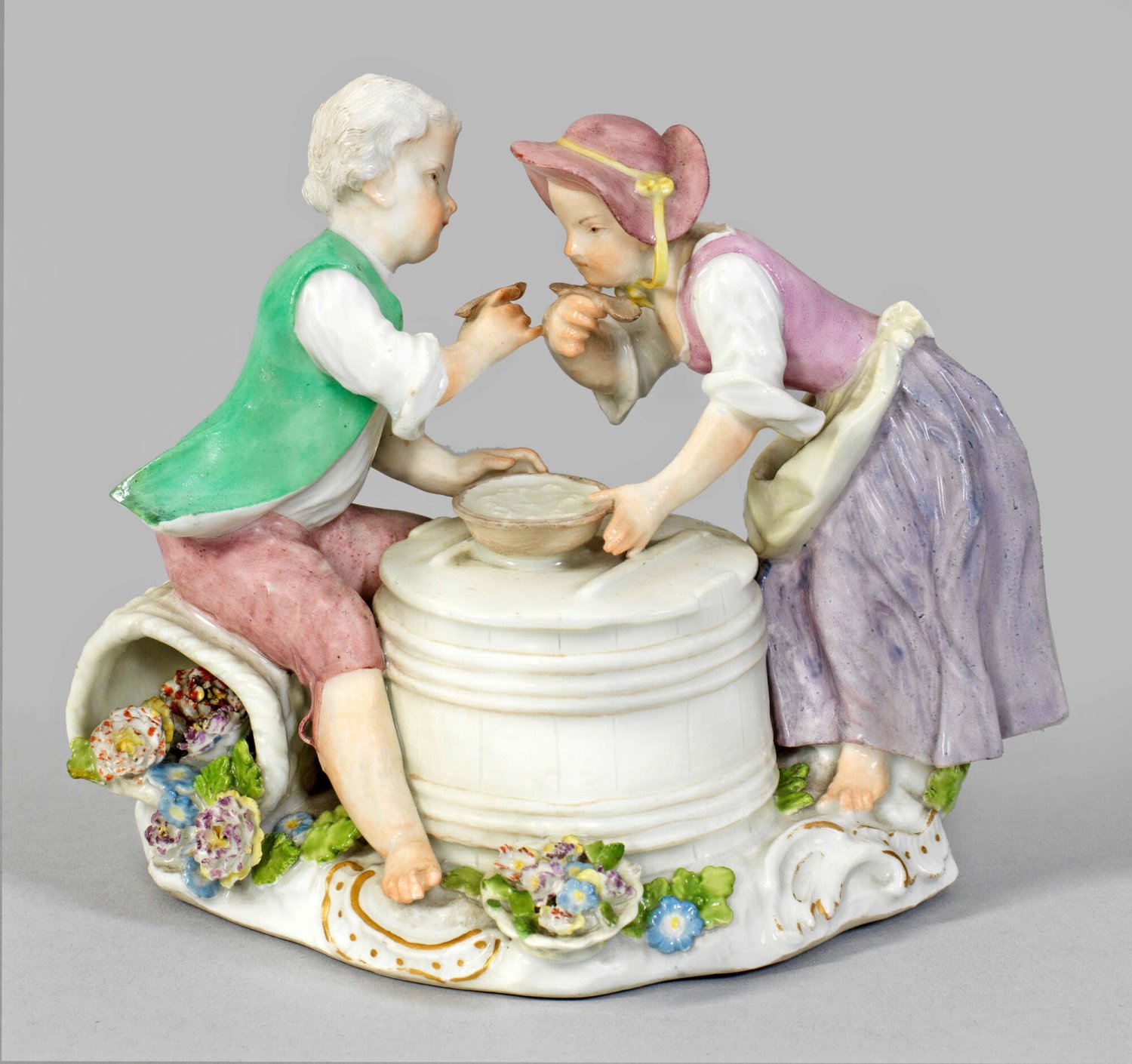 Kindergruppe Auf einem mit plastischen Blüten gefülltem, geflochtenem Korb sitzender Knabe bzw. stehendes Mädchen, Brei aus einer Schale löffelnd. Polychrome Malerei mit Goldkonturierung. Entw. Johann Joachim Kaendler. Minim. best.; Schwertermarke. H. 12 cm.