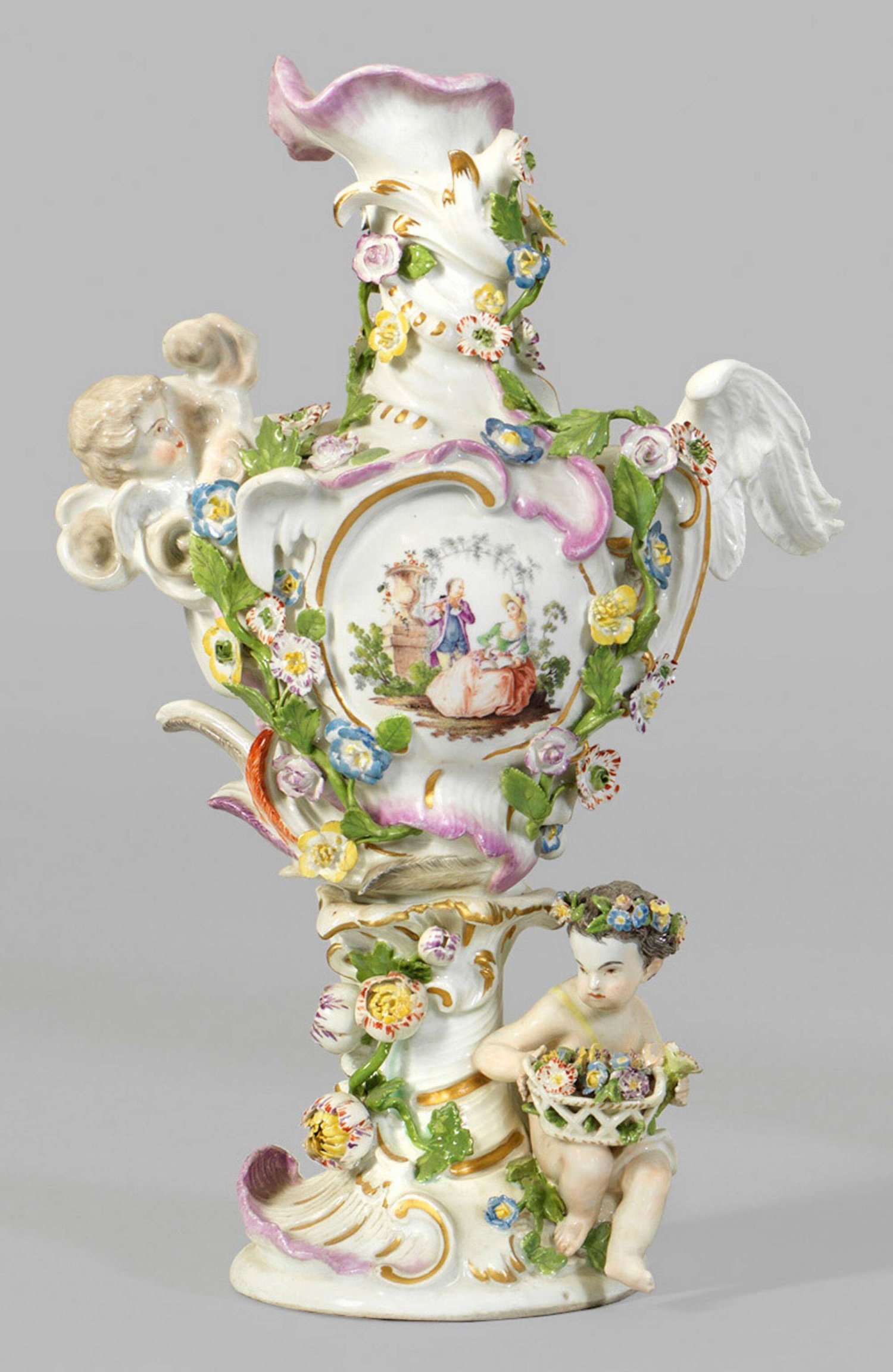 Kaminvase als Allegorie des Frühlings aus der Serie "Vier Jahreszeiten". In großen Rocaillen aufsteigender Rundfuß mit balusterförmigem, leicht bombiertem Korpus, übergehend in volutenartig gedrehten Hals mit geschwungenem Rand. Auf der Wandung plastischer Dekor aus fein aufgelegten Blüten und Blattranken sowie einem unterhalb sitzenden Knaben mit Blumenkorb, den Frühling darstellend. Oberhalb modellierte, geflügelte Amorette zwischen Wolken bzw. plastischen Amorettenflügeln. Schauseitig, in kartuschenförmiger Rahmung, galante, szenische Darstellung von Watteaufiguren in baumbestandener Landschaft. Polychrome Malerei mit Goldkonturierung. Unw. rest.; Entw. Johann Joachim Kaendler und Peter Reinicke. Schwertermarke. H. 30,5 cm.
