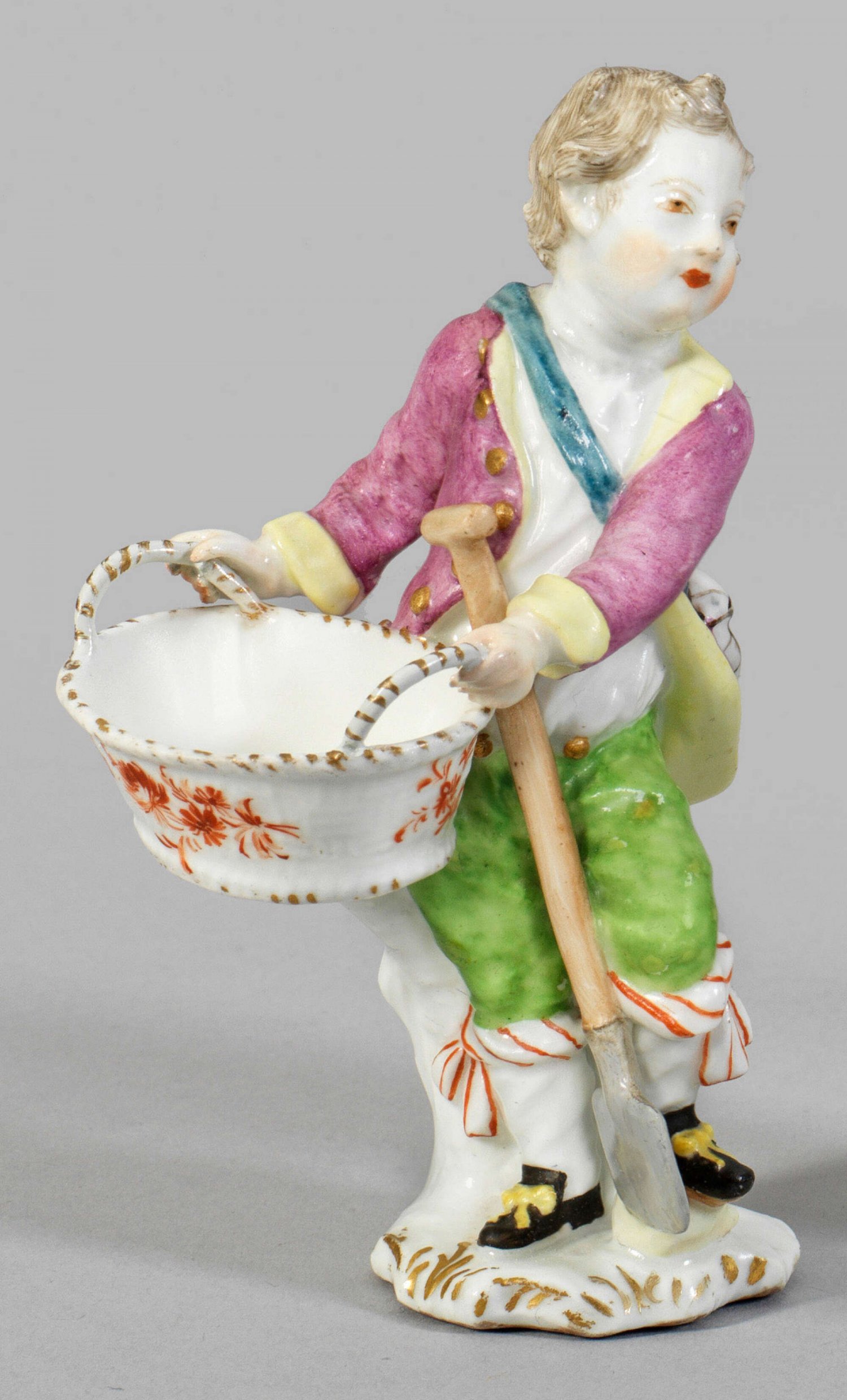 Gärtnerkind mit Korb Auf rocaillereliefiertem Sockel stehender Knabe mit Schaufel in sommerlicher Kleidung, in den Händen einen Korb haltend. Polychrome Malerei mit Goldkonturierung. Minim. rest.; Schwertermarke. H. 12 cm.